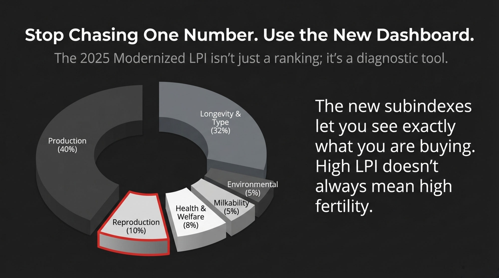 - New tools help you see the trade-offs: Lactanet’s six LPI subindexes show exactly where a bull stands on Reproduction, Health & Welfare, Milkability, and Environmental Impact—not just total merit.