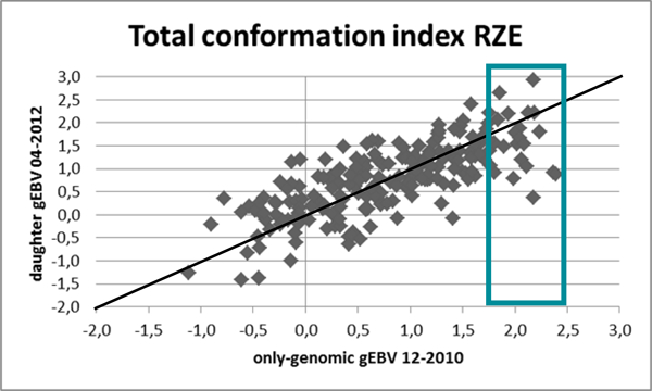 Dr Rensing included in his study the 199 bulls in Germany that received their first official daughter proof in April 2011. He compared their December 2010 genomic indexes to their April 2012 proofs. The reason April 2012 (the 4th proof run for the bulls) was chosen was because it allowed for more daughters, more data from each daughter and for daughters to be in their second lactation. Or in short, provided for more accuracy. Dr Rensing studied the correlations between the two sets of indexes and also how the very best sires performed. The very best sires are important as they are the ones returned to active AI service and used as the sires of sons.