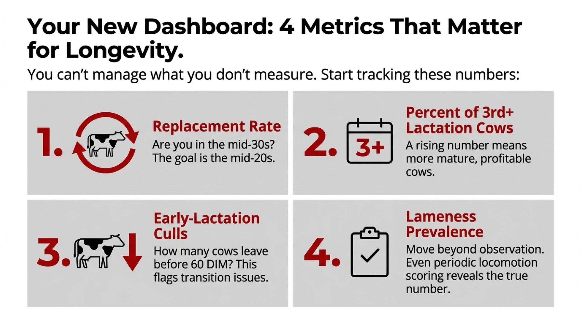 - The savings are real: Dropping the replacement rate from 35% to 28% saves ~US$180,000/year in a 1,000-cow herd
