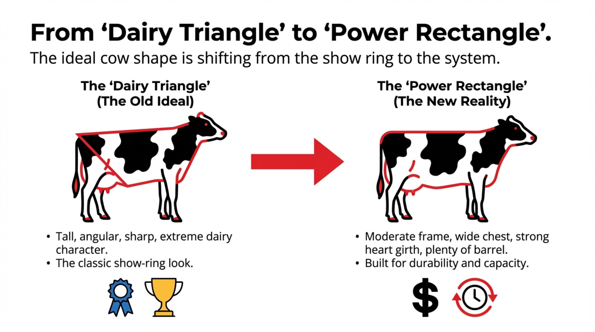 | Characteristic | “Dairy Triangle” (Traditional Show Ideal) | “Power Rectangle” (System Cow) |