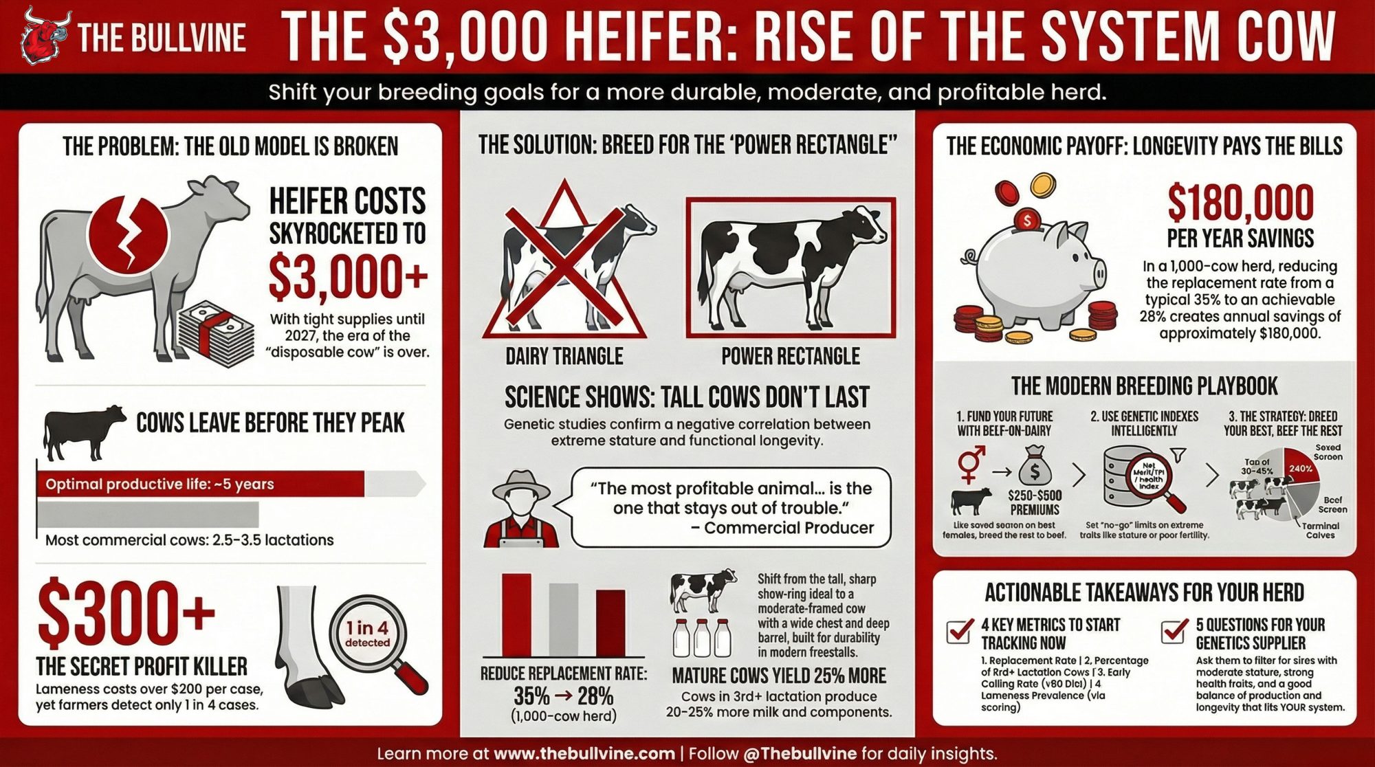 The prettiest cow on your dairy might be your most expensive one. With replacement heifers hitting US$3,000+ and CoBank projecting tight supplies through 2027, commercial dairies are rethinking the “ideal cow”—moving from the tall, angular “Dairy Triangle” toward a moderate-framed “Power Rectangle” built for durability, not ribbons. The math supports the shift: reducing replacement rate from 35% to 28% saves roughly US$180,000 annually in a 1,000-cow herd. University of Florida research suggests an optimal productive life is around 5 years, yet most operations average just 2.5–3.5 lactations—with lameness alone (often undetected in 3 of 4 cases) quietly draining US$300+ per incident. Forward-thinking producers are responding with a practical playbook: combine Net Merit with health indexes, cap extreme stature, and let beef-on-dairy premiums fund more selective breeding. She won’t win shows, but she pays her bills—and in this market, that’s exactly the cow you need.