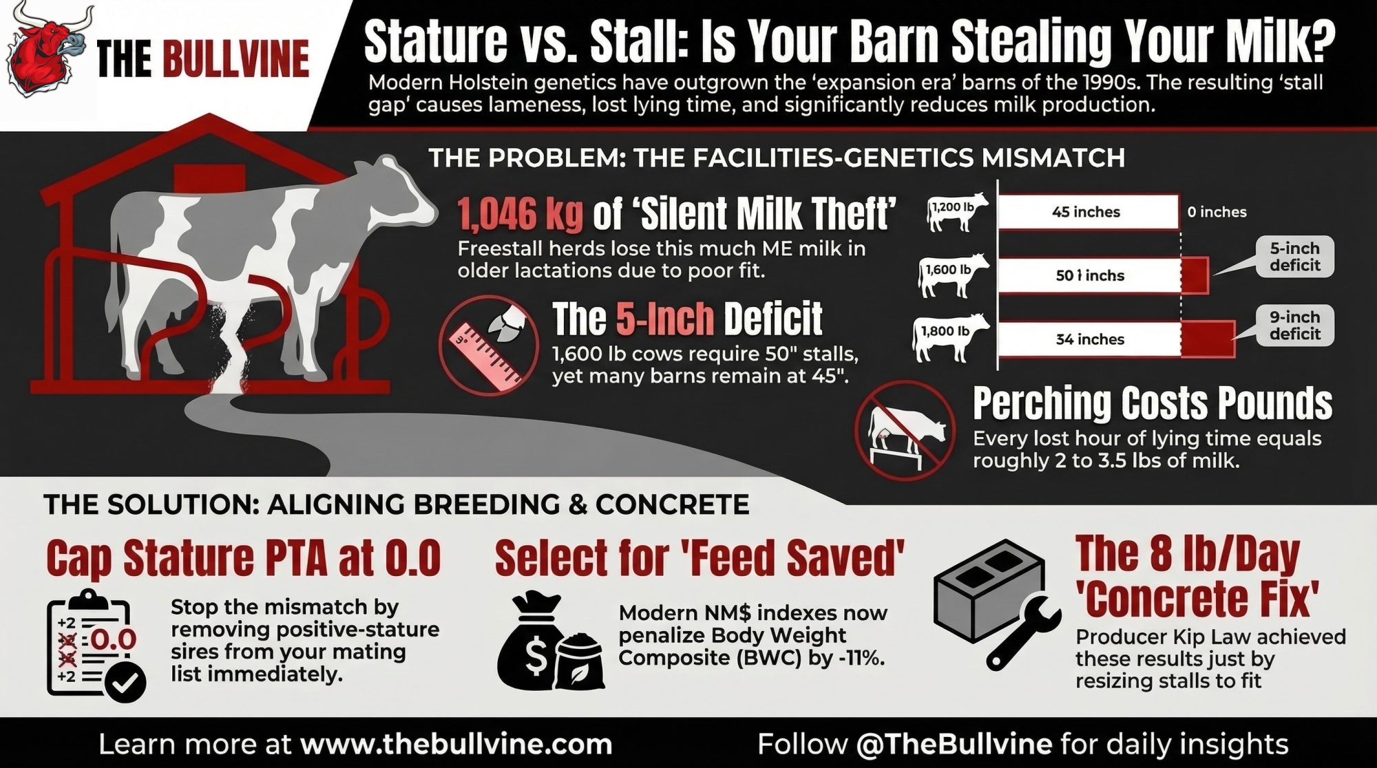 - If your three‑year average sire BWC is positive and your mature‑cow stalls are under 48 inches, your mating program and your barn are pulling in opposite directions. You don’t fix that with more hoof‑trimming visits.