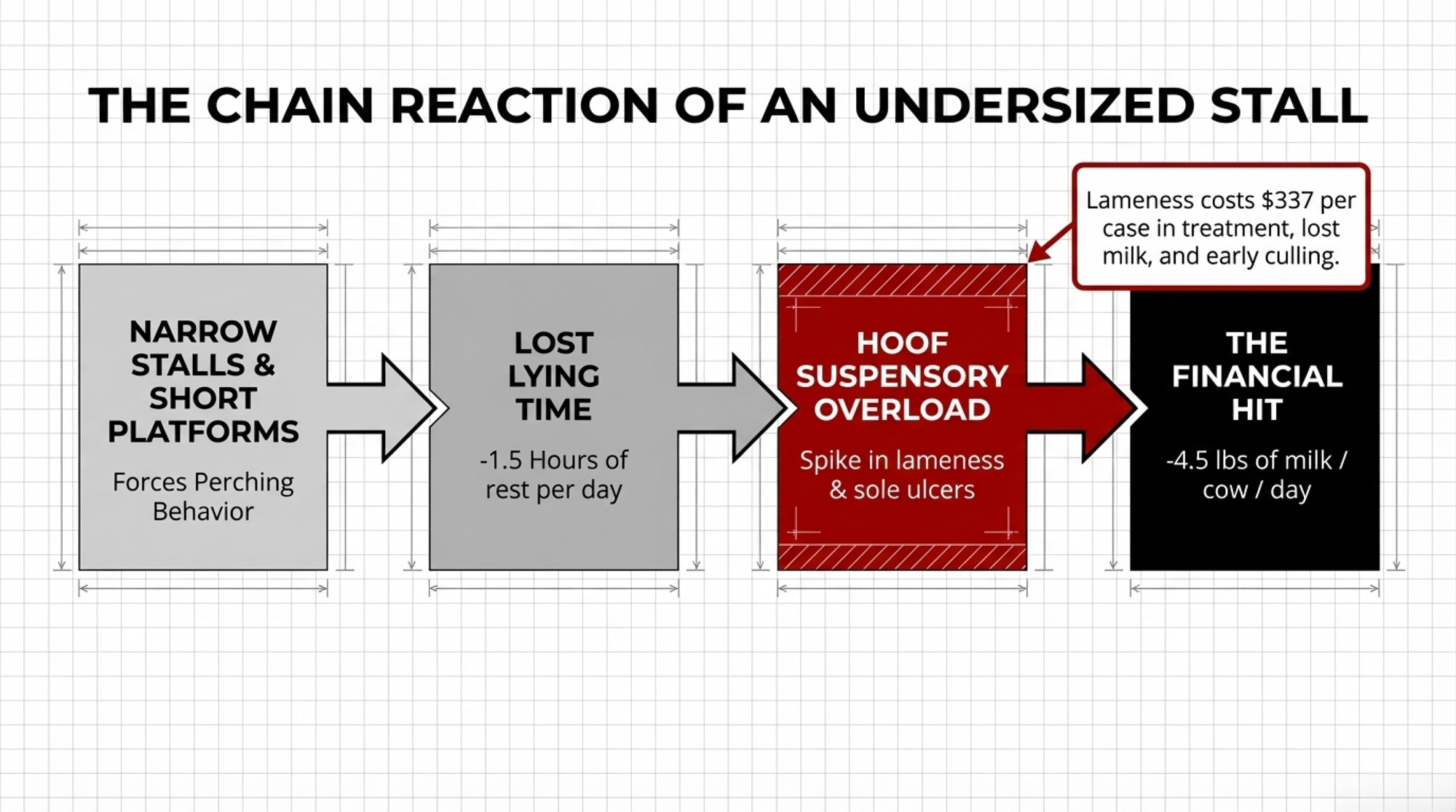 - If your mature‑cow stalls measure 45–46 inches and your average cow is in the 1,600‑lb range, you’re 4–5 inches short of Dairyland’s recommendation. Expect more perching, more lameness, and a bigger ME gap in older cows until that changes.