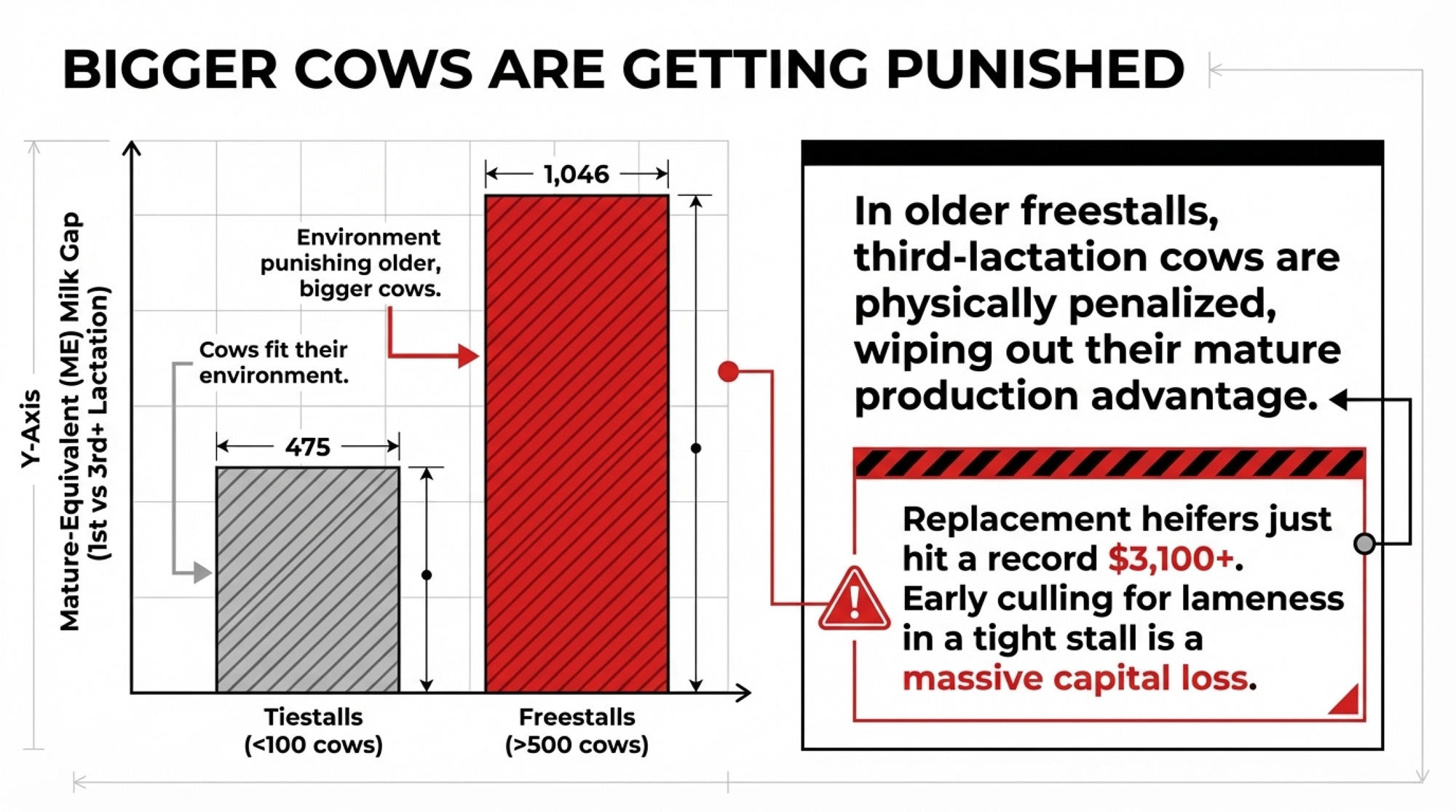 - Cook’s Wisconsin data showed a 1,046 kg ME gap between first‑lactation and third‑or‑greater‑lactation cows in large freestall herds — more than double the 475 kg gap in tie-stall herds. That’s the environment punishing bigger, older cows, not genetics suddenly “quitting.”