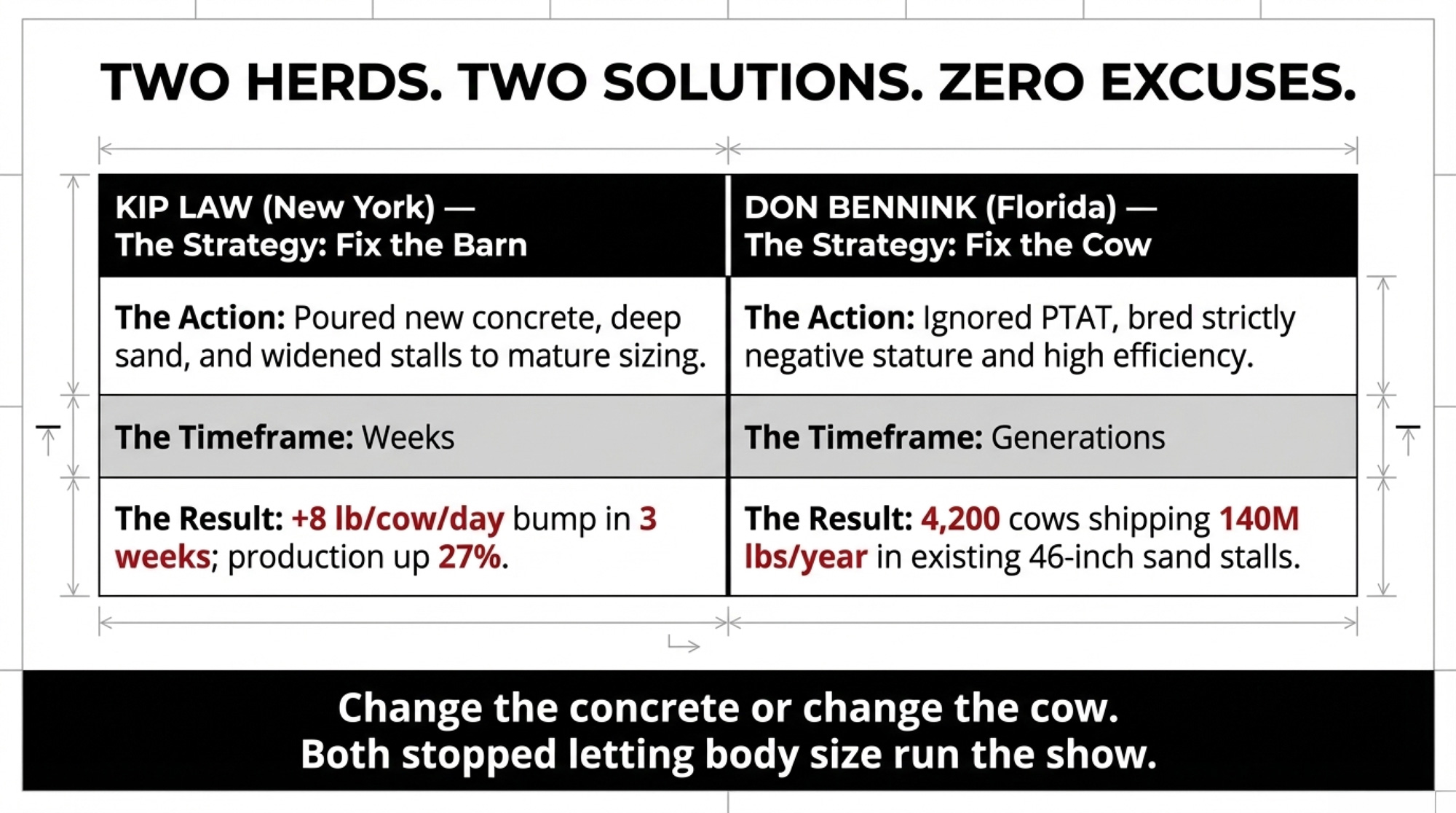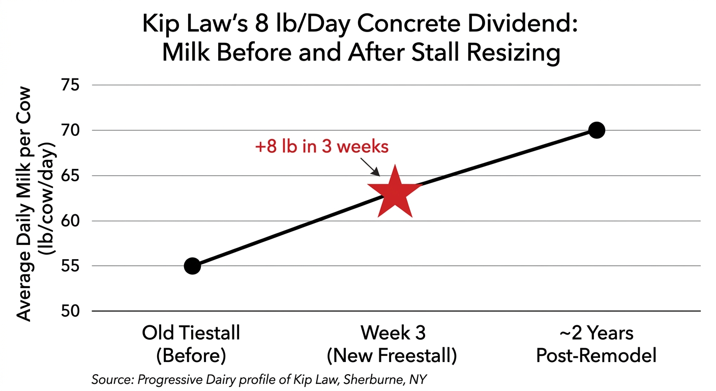 - Law’s herd gained 8 lb/cow/day in three weeks — not by changing sires, but by giving them stalls that actually fit. Over two years, daily milk increased by 27%, and SCC fell to about 100,000, despite the same genetics.