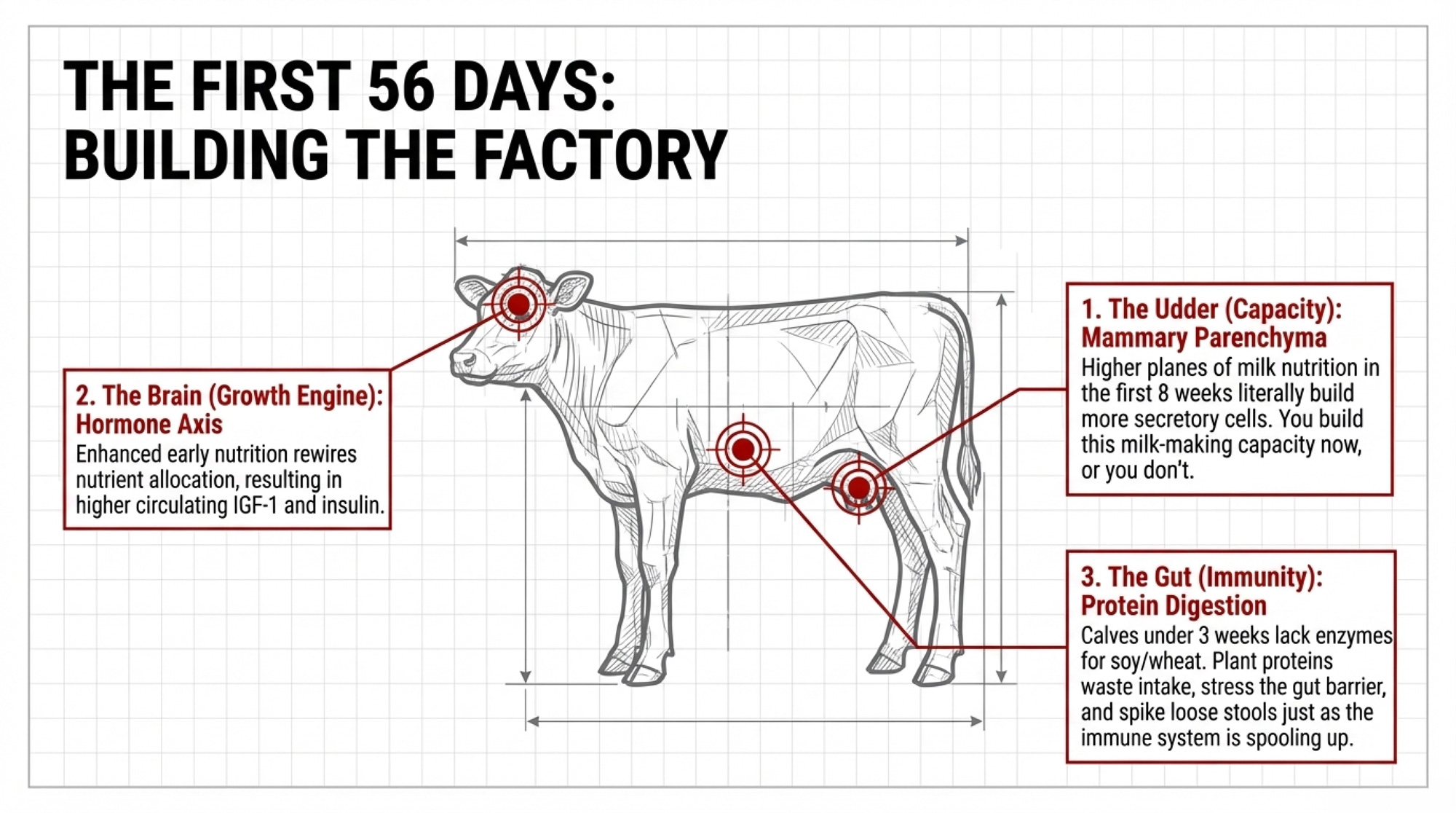 You’re building a mammary factory. Trials comparing restricted and enhanced preweaning feeding show calves on higher planes of nutrition develop substantially more mammary parenchyma — the secretory tissue — by eight weeks of age. More parenchyma now means more secretory cells later. That’s literal milk‑making capacity you either build or you don’t.
