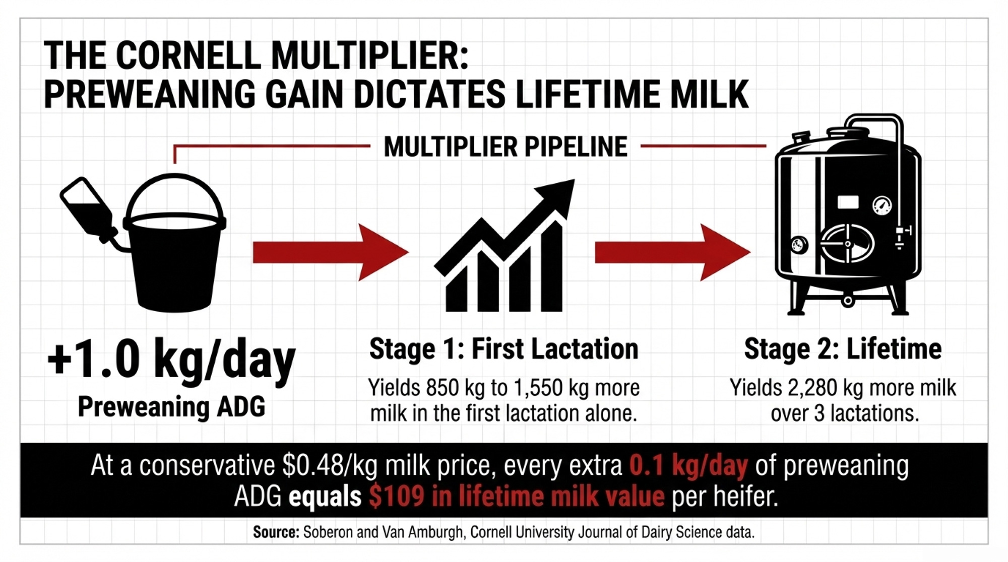 Felipe Soberon and Mike Van Amburgh at Cornell pushed that shift hard in their 2012 Journal of Dairy Science study. They tracked 1,244 heifers in the Cornell research herd and 624 heifers on a commercial dairy, tying their preweaning average daily gain (ADG) back to first‑lactation milk. For every 1.0 kg/day of preweaning ADG, they saw about 850 kg more milk in first lactation at Cornell and 1,113 kg more in the commercial herd. Later datasets pushed that first‑lactation response up to around 1,550 kg per 1 kg/day of preweaning ADG in some datasets.