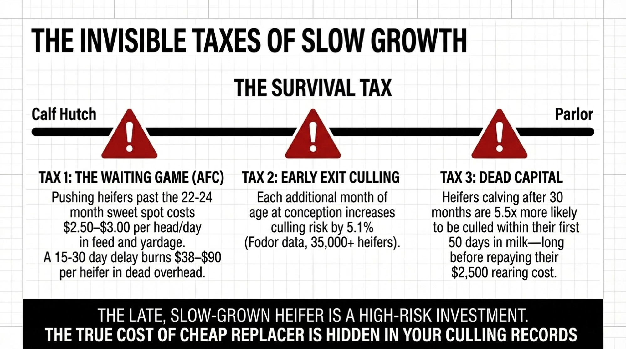 | Survival risk | +5.1% culling risk per extra month; 5.52× risk after 30 mo calving | Late, slow‑grown heifers are the riskiest “investments”. |