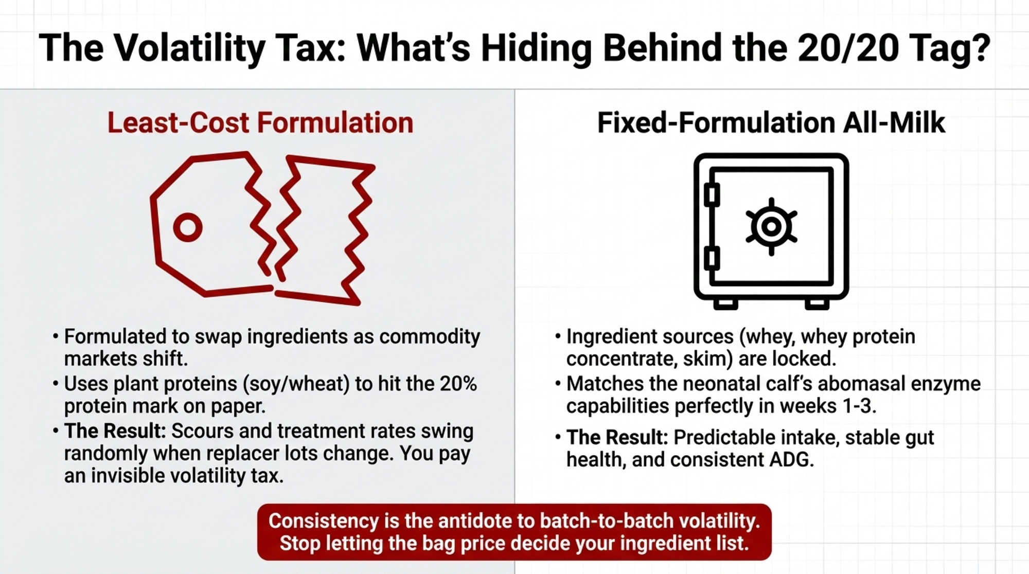 Why it matters: Least‑cost formulation is built to swap ingredients as commodity markets move while keeping the 20/20 tag on paper. On some herds, those quiet shifts show up as an invisible “volatility tax” on calf performance when ingredient changes affect how calves respond. Fixed‑formulation, all‑milk replacers don’t make calves bulletproof, but they remove one of the biggest hidden variables in your heifer program.