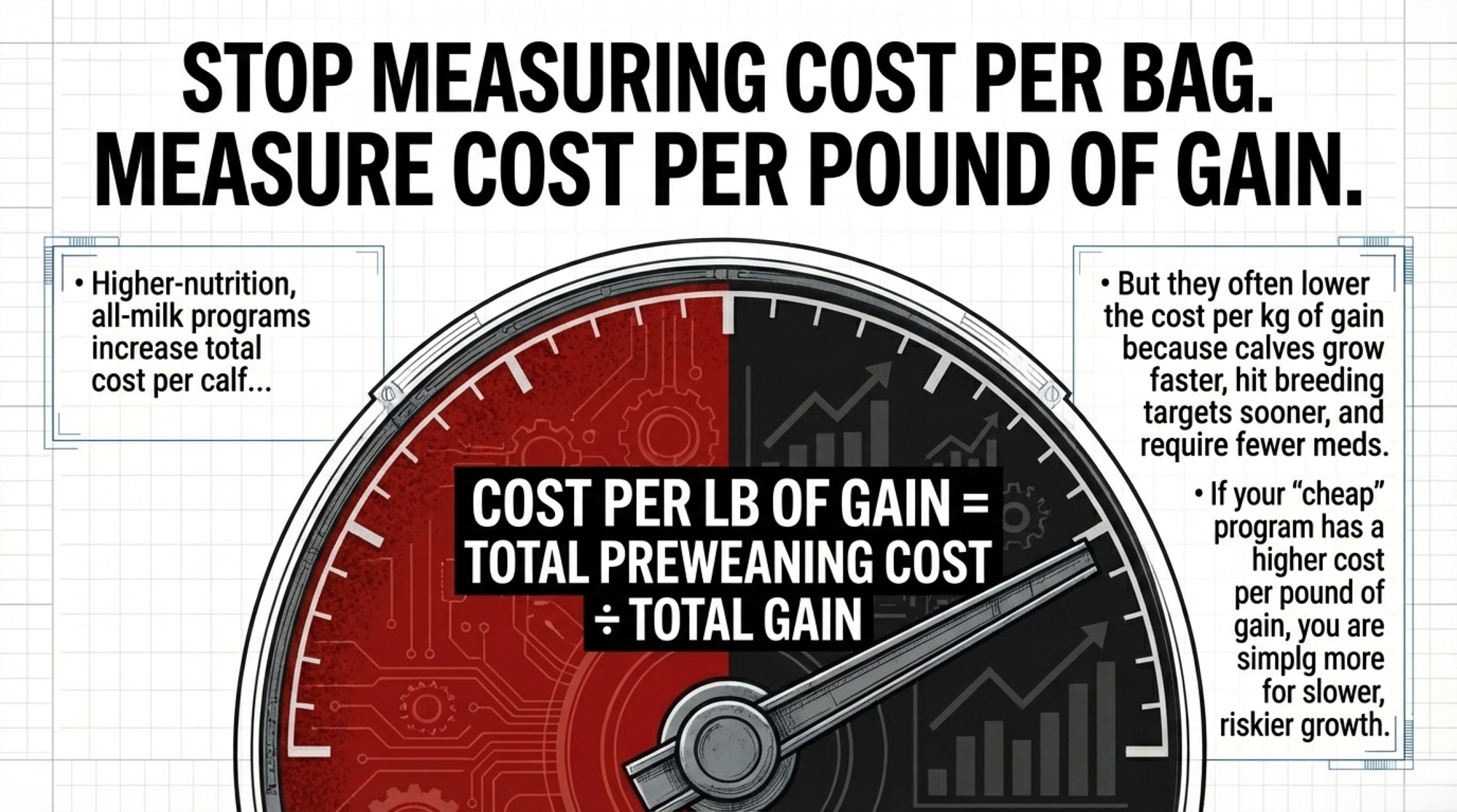 | Cost per kg of gain (preweaning) | Lower on all‑milk, higher‑plane programs because calves grow faster and stay healthier. | “Cheap” program shows higher cost per kg of gain than premium. |