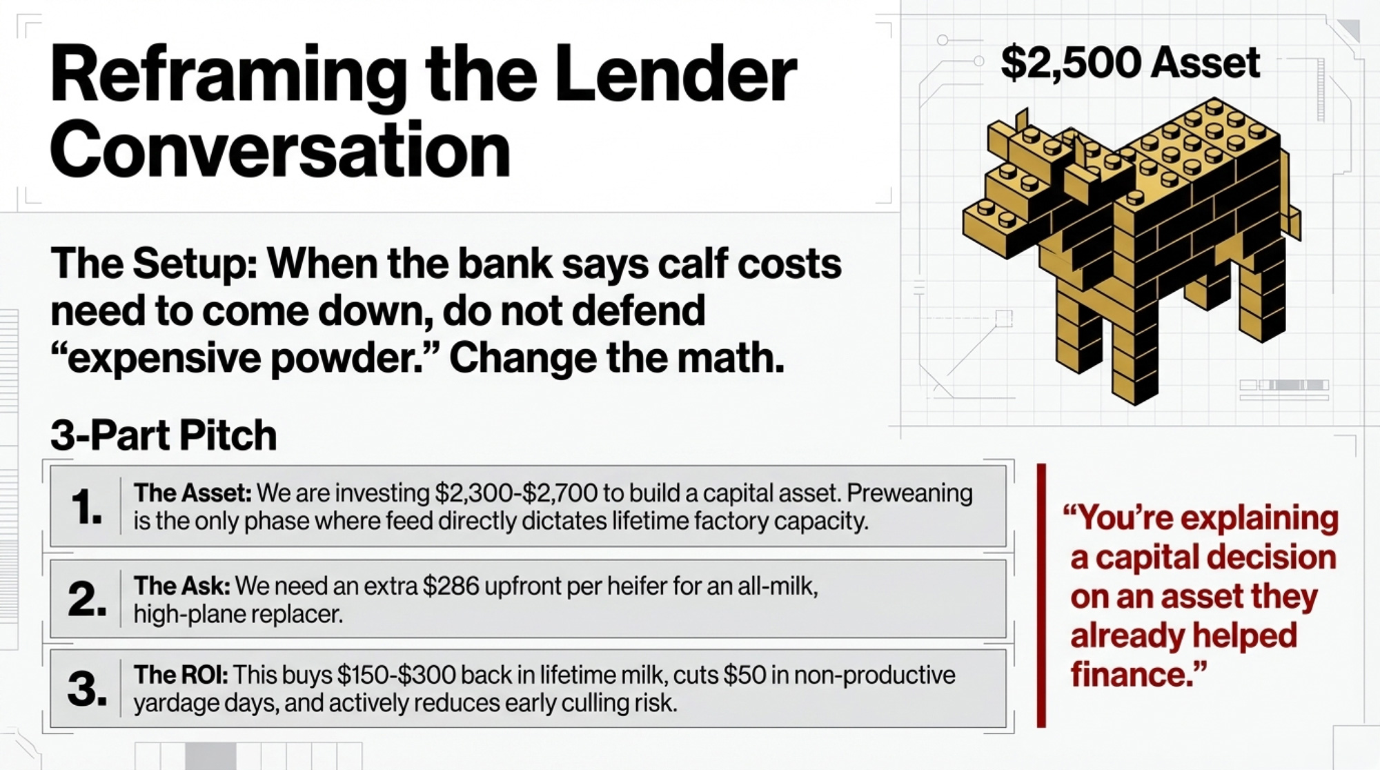 - If you’re walking into a lender meeting under pressure to cut calf costs, go in with a three‑part story — milk, days to first calving, and survival risk — instead of a single bag price. Let the math make the case for you.
