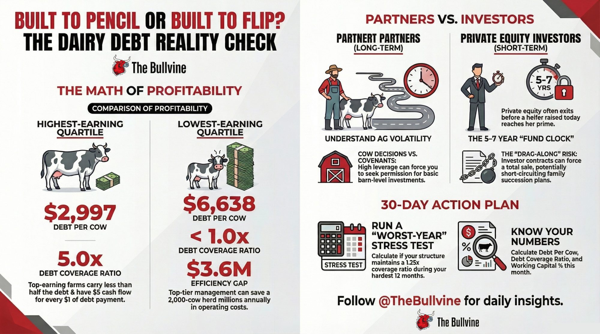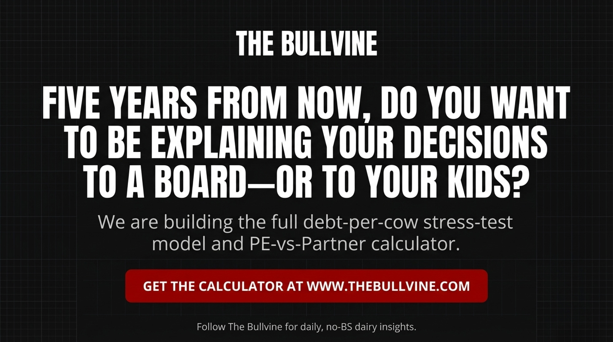 We’re building the full debt‑per‑cow stress‑test model now — covenant math, leverage thresholds by herd size, and a PE‑vs‑partner calculator you can drop your own numbers into. Watch for it in The Bullvine Weekly and our follow‑up economics deep dive.