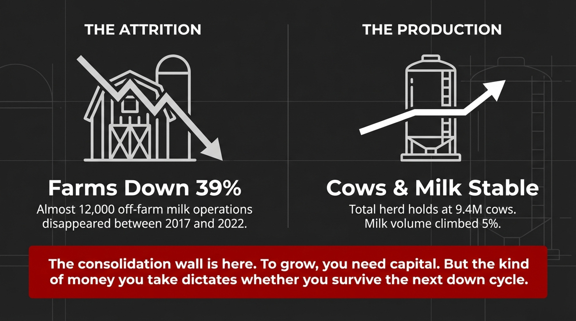 Nearly 4 in 10 U.S. dairy farms with off‑farm milk sales disappeared between 2017 and 2022. Cow numbers barely moved — still around 9.3–9.4 million head — but milk shifted hard into fewer, bigger herds. Those herds now face a blunt question: do you take fast capital and more leverage, or do you find slower money that lets you sleep at night?