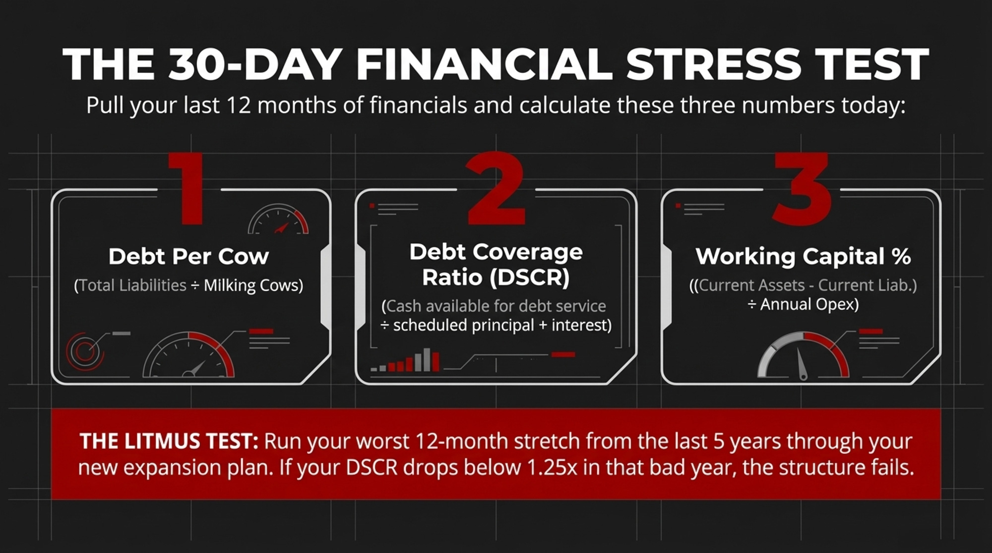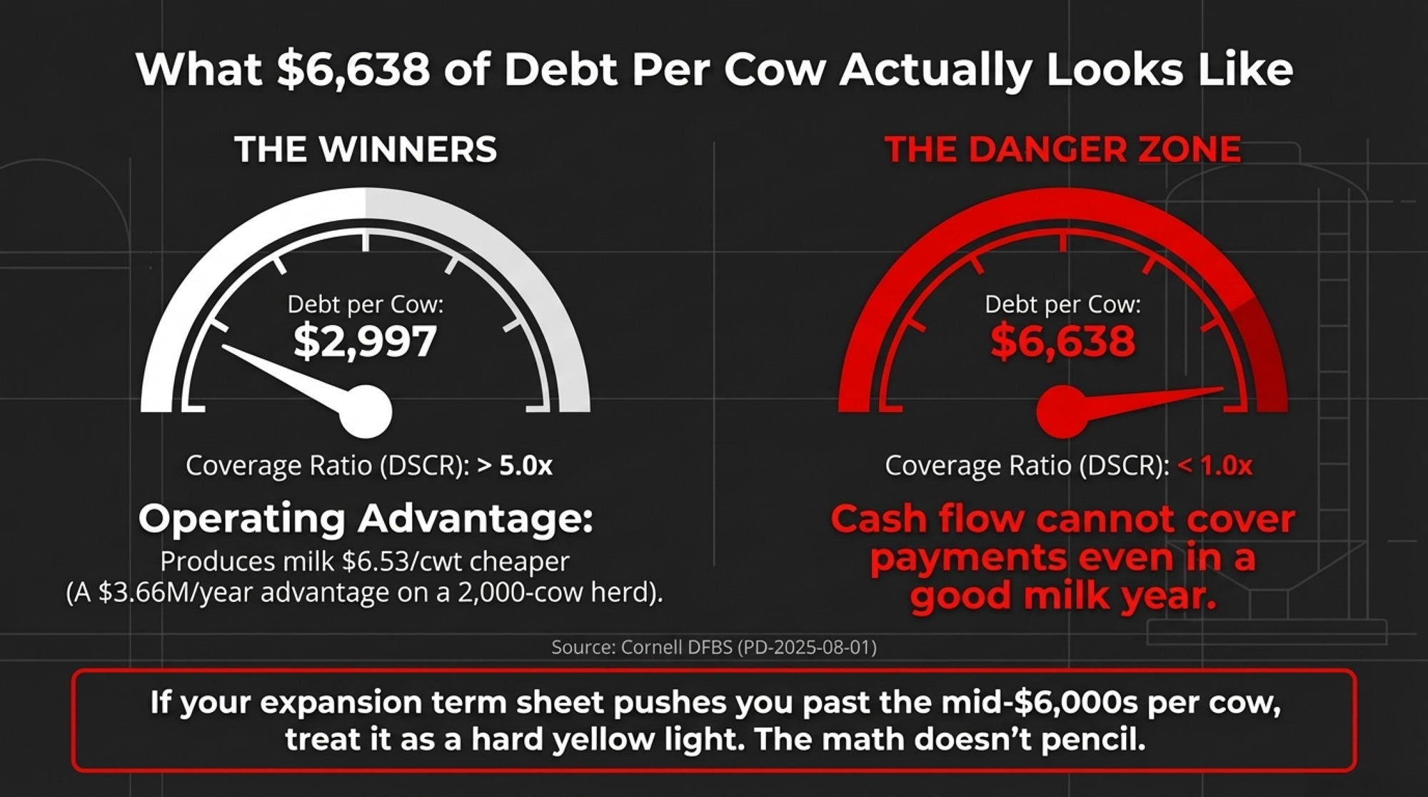 What it requires: Patience. Relentless work on cost per cwt instead of headline herd size — feed efficiency, cow longevity, reproduction, labor efficiency. In DFBS data, the most profitable, lower‑debt farms didn’t just borrow less; they also produced milk several dollars per cwt cheaper. That combination is what gives them room to breathe.