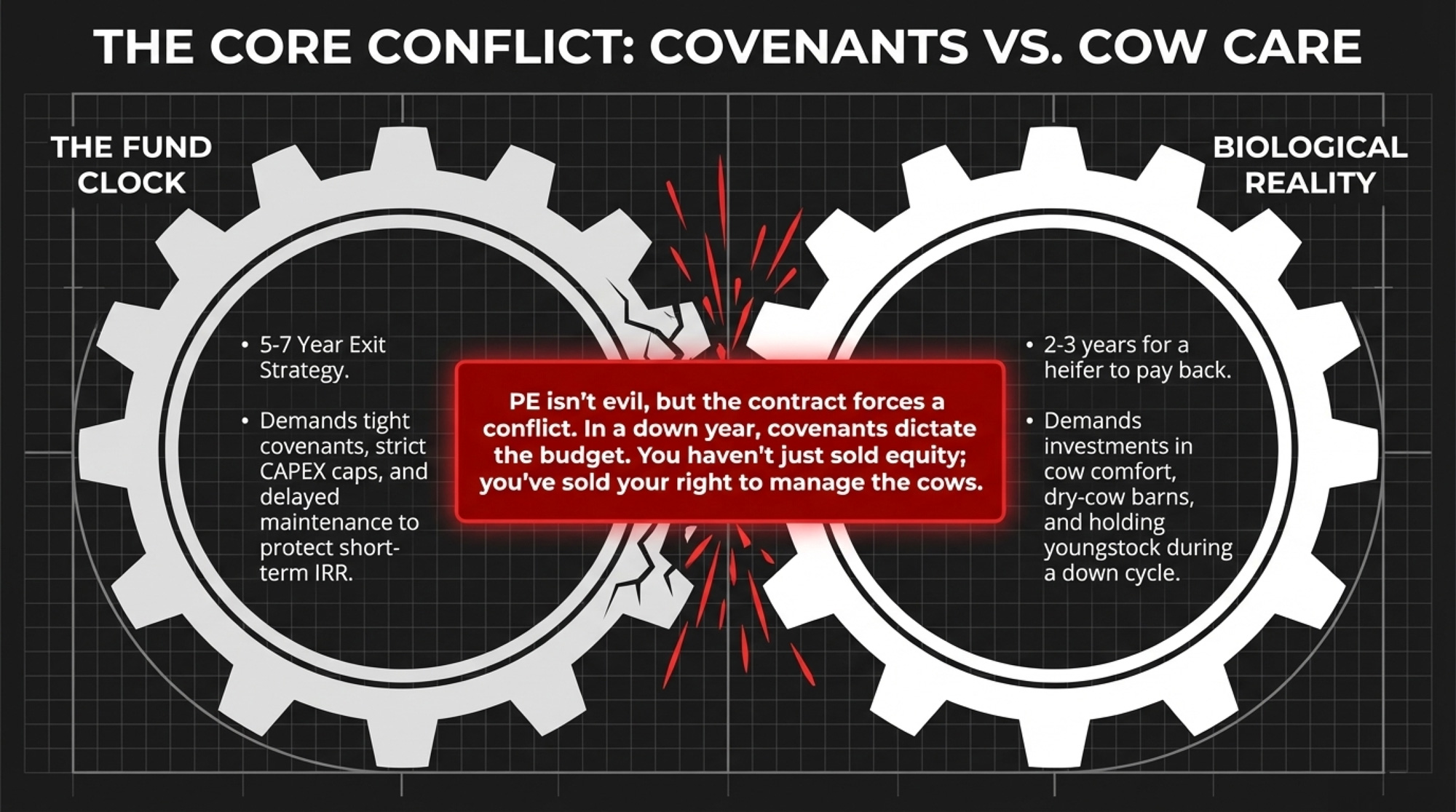 You’ve probably had that year already. Health wreck, feed quality issue you chase for months, or a long run of heat that drags component tests. Your instinct says: slow expansion, keep youngstock, invest in a dry‑cow barn or fans, buy time to reset. Tight covenants can push in the opposite direction: freeze spending, delay maintenance, and more milk per stall. That’s the structural conflict Bethard described on the panel — not that PE is evil, but that the contract can force you to make the opposite call from what your gut and cows are telling you.