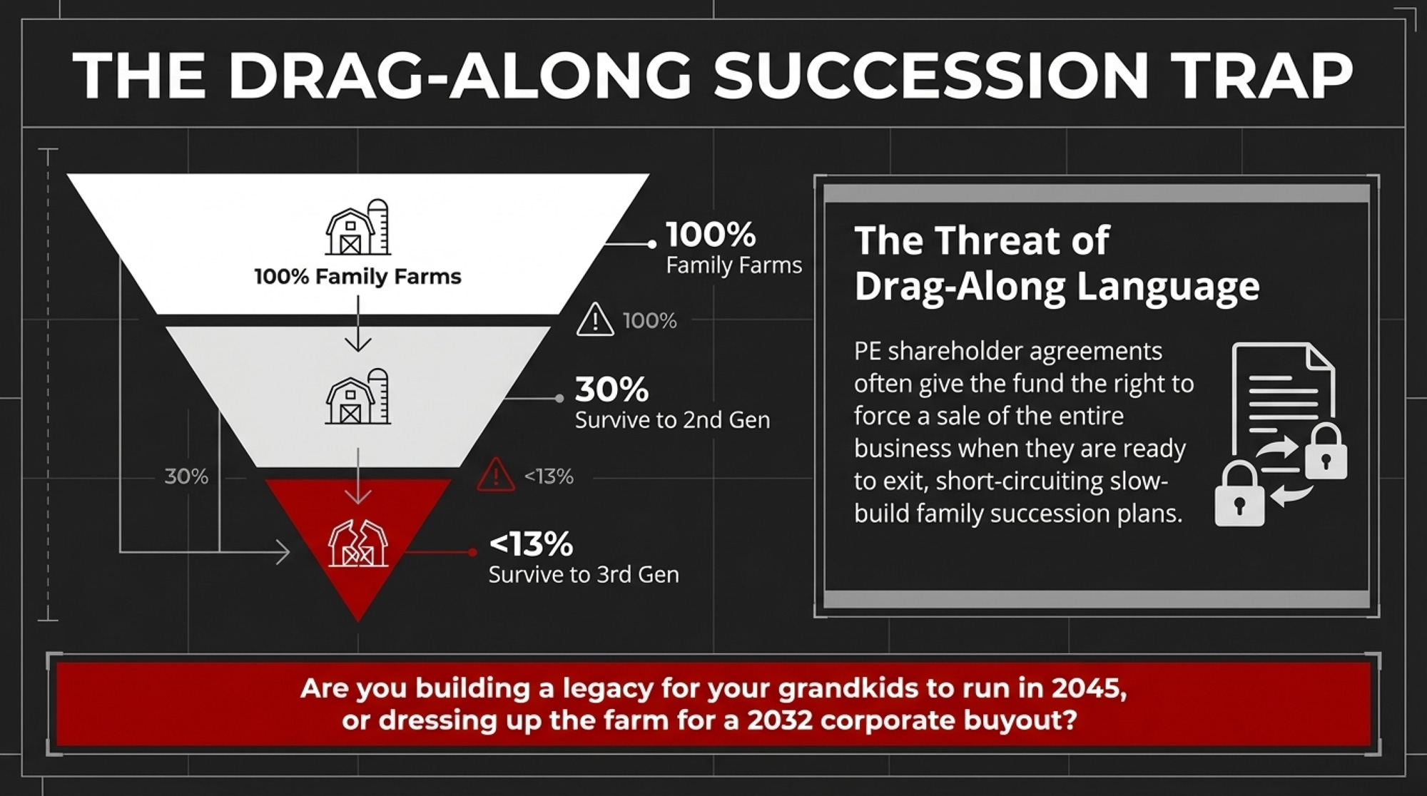 Then there’s drag‑along language. Many PE shareholder agreements give the fund the right to force a sale of the whole business when they exit. In corporate settings, that’s standard. On a family place, depending on how it’s written, it can short‑circuit a slow‑build succession plan. Cross‑industry family‑business research consistently reports that only about 30% of family businesses transition to the second generation, and fewer than 12–13% make it to the third. Contract provisions that accelerate a sale timeline don’t improve those odds.