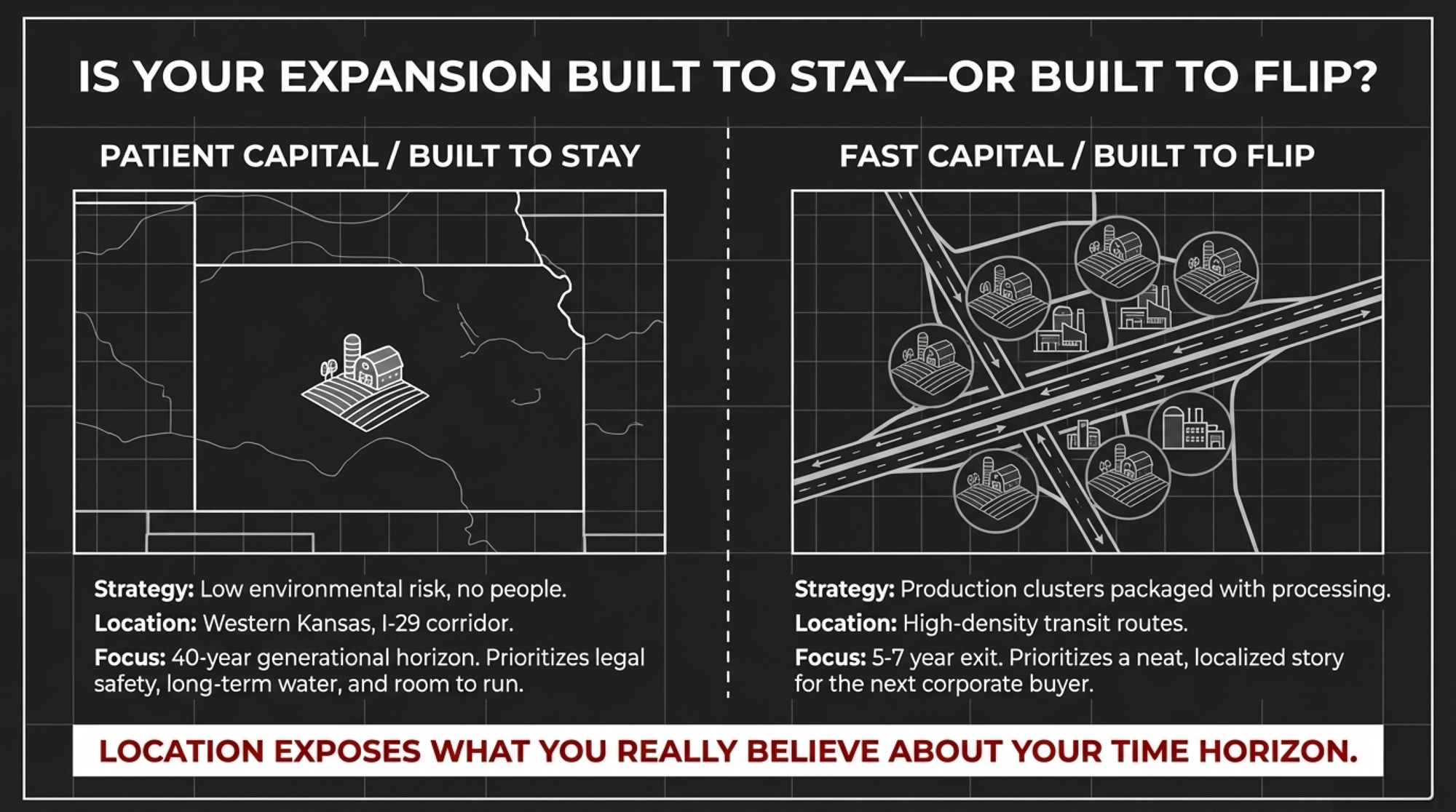 Investors running a shorter‑term play often think about geography differently. They like production clusters that can be packaged with processing capacity and sold together: multiple herds within hauling distance of a plant, good roads, a neat story for the next buyer. That doesn’t automatically make a site wrong for a 40‑year plan. But it means you need to double‑check the long‑term water, permitting, and community story — not just the current land price.