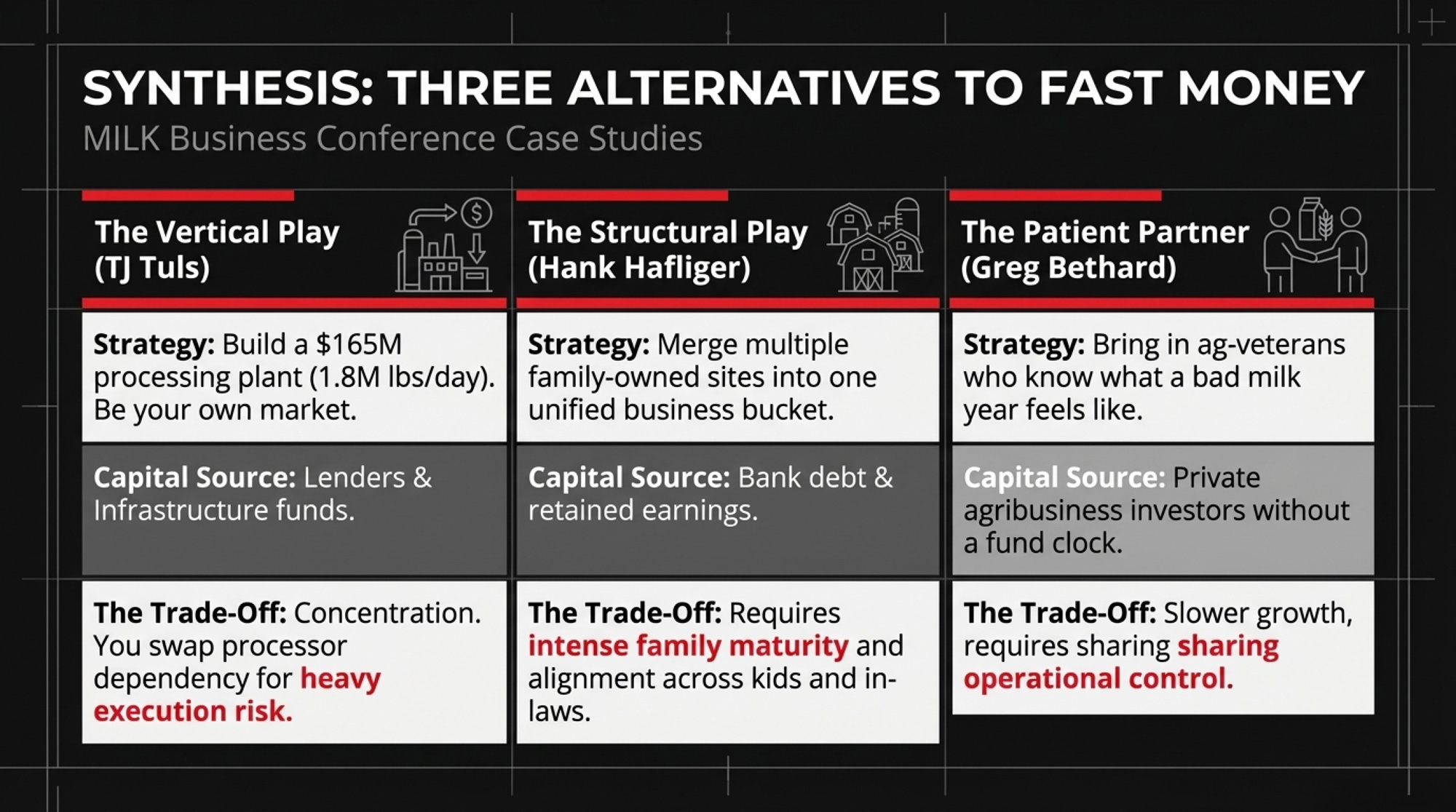 | Greg Bethard— High Plains Ponderosa Dairy, KS | Patient ag-industry partners; no PE | Private partnership | Plains, KS → Hilmar Cheese, Dodge City | Slower growth; full cow-level decision control | None — family timeline |