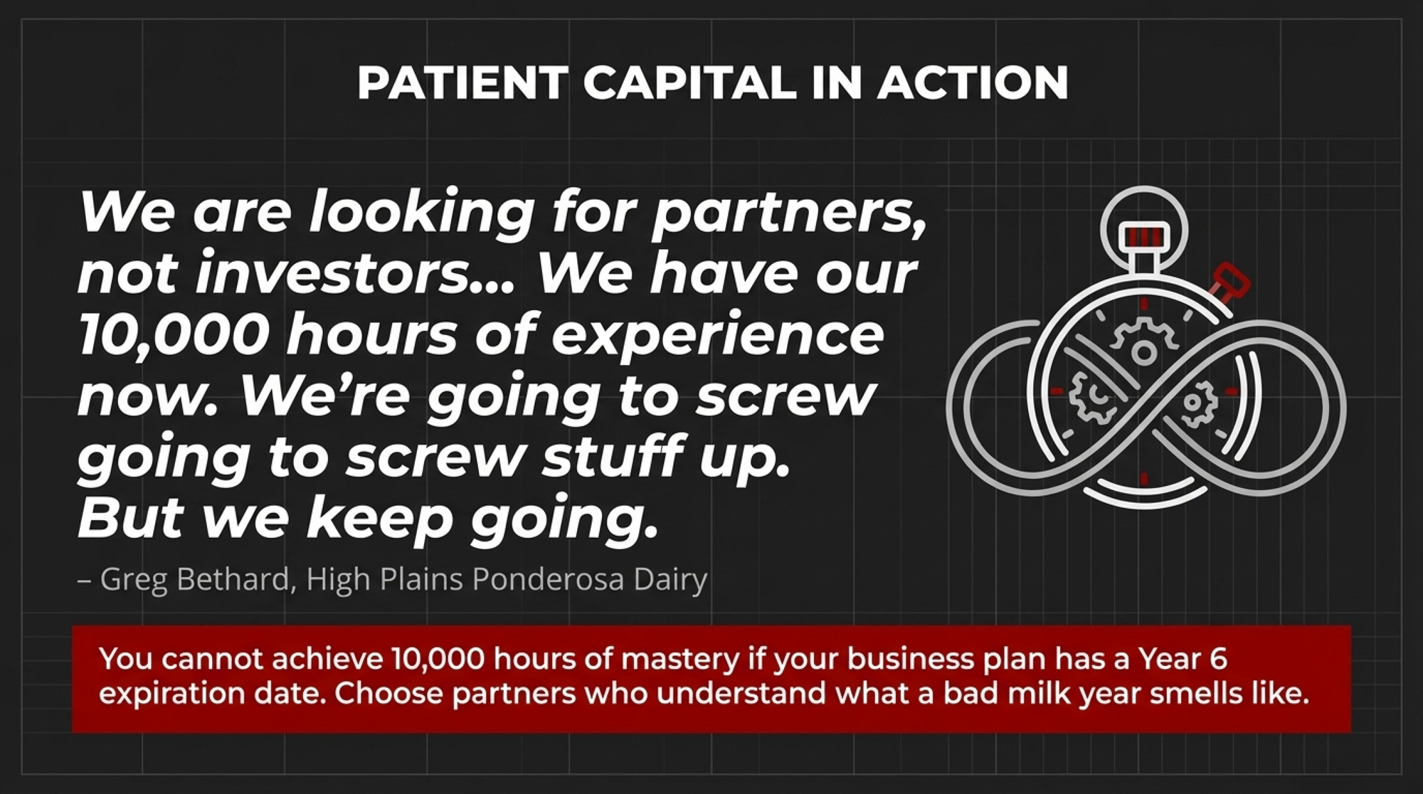 Bethard went for patient partners with ag scars. High Plains Ponderosa has grown by bringing in people who already know what a bad milk year feels like — not financial sponsors planning a sale before the heifers from this year ever calve. He’s honest about the early expansion learning curve. “We have our 10,000 hours of experience now,” he said, borrowing Malcolm Gladwell’s mastery concept. “We’re going to screw stuff up. There are going to be bad days… But we keep going at it, and we’ll get it figured out.”