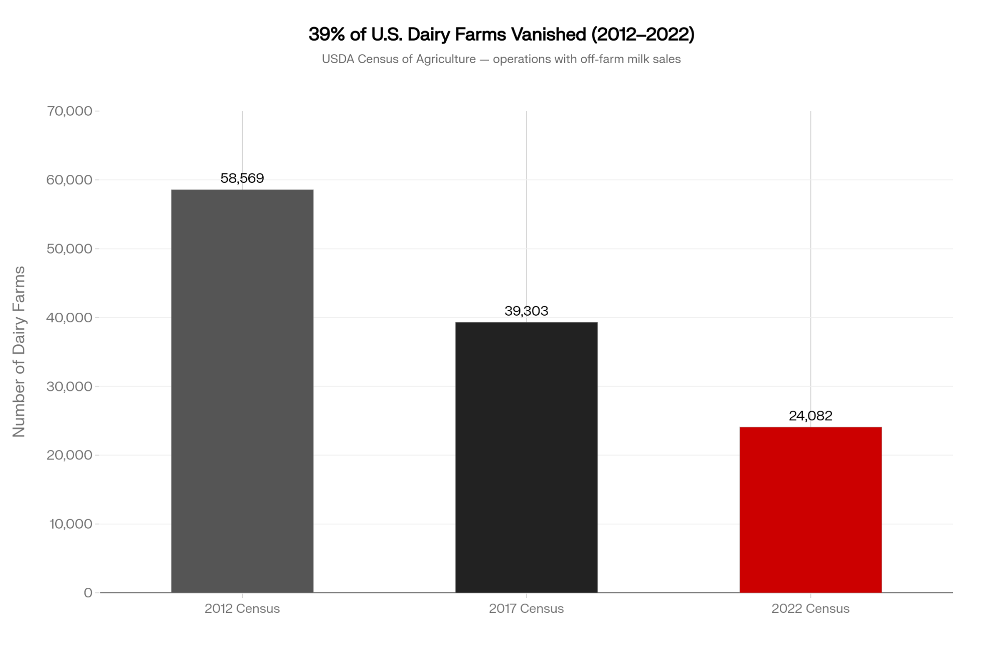 USDA’s 2022 Census of Agriculture shows the number of dairy operations with off‑farm milk sales fell from 39,303 in 2017 to 24,082 in 2022 — almost 12,000 farms gone, roughly a 39% decline. Over that stretch, total cow numbers held near 9.3–9.4 million while milk volume climbed about 5%. Just over 2,000 herds with 1,000‑plus cows now produce about two‑thirds of the country’s milk by value, according to Census analysis and Rabobank estimates. PE funds look at that curve and see a defensive thesis. People still buy food in a downturn.