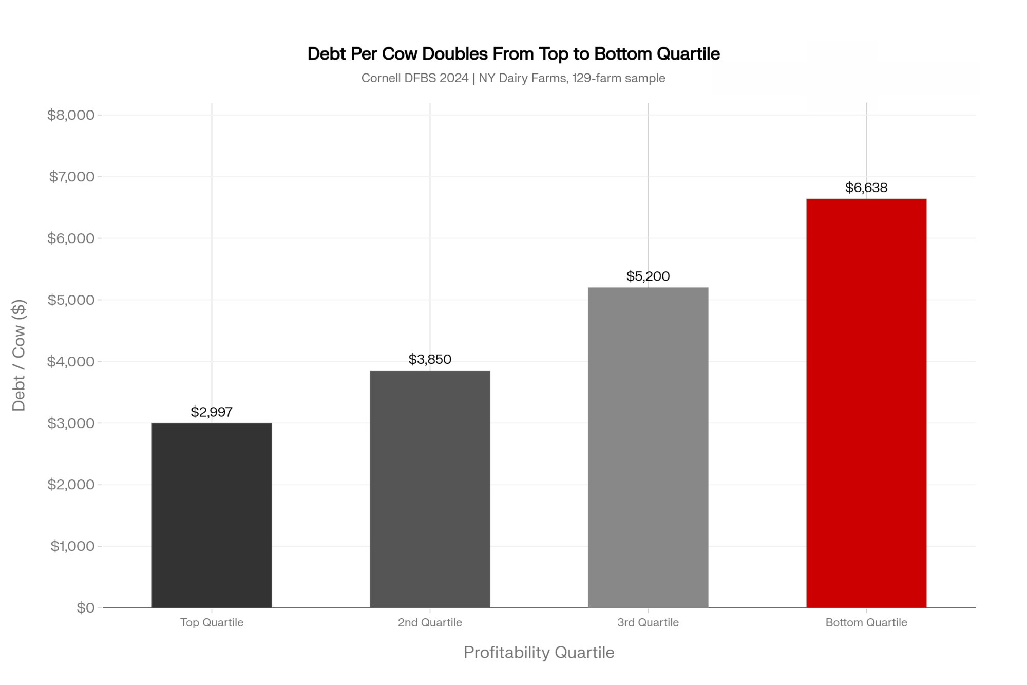 That’s New York data, not a national average — your region’s numbers will look different. But the pattern between top and bottom tends to hold across state farm‑business summaries. When any capital source — PE or otherwise — pushes you toward that $6,600‑per‑cow neighborhood before your earnings and cost structure say you belong there, the term sheet isn’t your biggest problem. The math is.