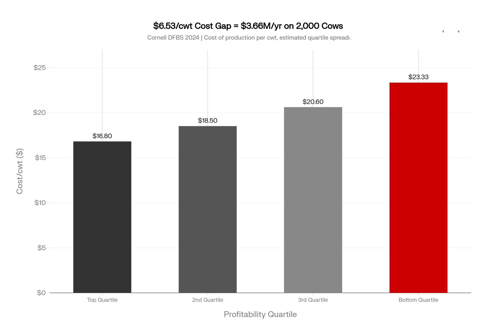 The cost‑of‑production gap runs parallel. Cornell’s public DFBS tables show top‑quartile farms producing milk several dollars per cwt cheaper than the bottom group — a function of better feed efficiency, labor productivity, and fixed‑cost absorption. Using a spread of roughly $6.53/cwt between the top and bottom quartiles, run that through a real herd: 2,000 cows shipping 280 cwt per cow per year gives you 560,000 cwt. Multiply by $6.53, and you’re looking at approximately $3.66 million per year in operating‑cost difference. Same milk prices. Same feed markets. Very different bank statements.