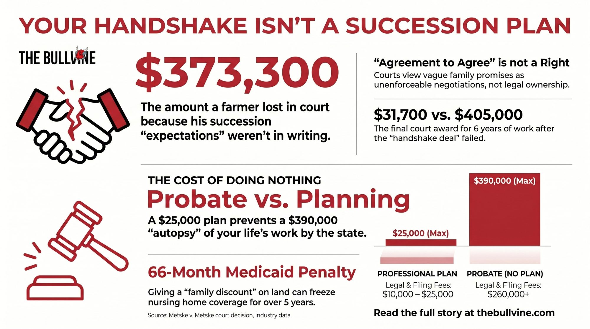 On a 200–600 cow dairy, getting all seven pieces right typically runs $10,000–$25,000 in professional fees [NEEDS: source — published ag‑law firm fee range or UW Extension farm transfer publication; Menn Law Firm and Ruder Ware LLSC have published fee guidance consistent with this range]. Nobody pretends that’s nothing. Line it up against a $305,000–$390,000 probate bill or a roughly $707,000 Medicaid penalty, and it starts looking like the cheapest insurance policy on the farm.