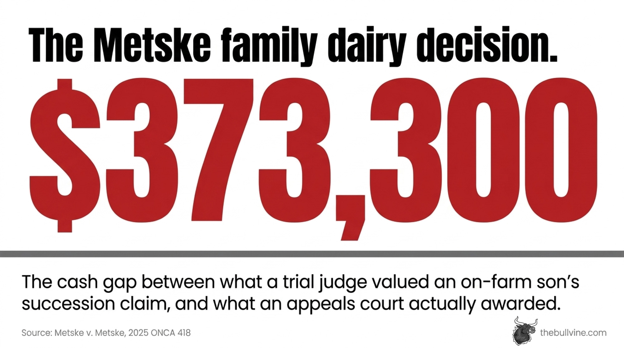 The court record shows they shipped 96 head through a catalog sale at OLEX — Ontario Livestock Exchange — and moved off‑farm during that transition. A trial judge valued their succession claim at $405,000. The Ontario Court of Appeal reduced that to $31,700 — the net value of $33,700 in concrete and equipment upgrades left behind, minus $2,000 in farmhouse damage. That $373,300 gap is what the court determined informal assurances were worth once enforceable property rights were tested.