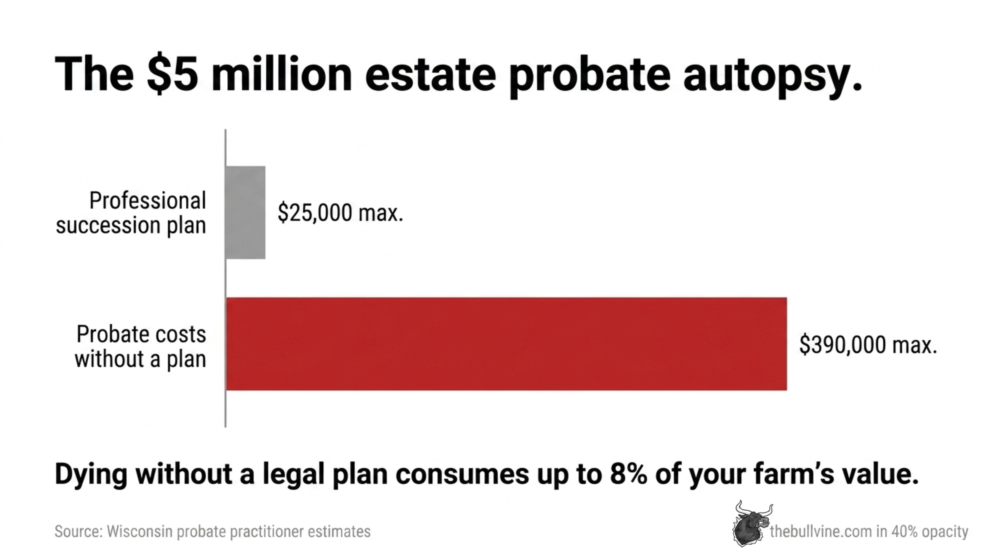 If a founder dies with land, buildings, cows, and accounts in their personal name — no trust, no entities — everything falls into the probate estate. For a $5 million operation in Wisconsin, based on published fee ranges from Wisconsin probate practitioners, a realistic probate bill looks more like a feed contract than a rounding error: