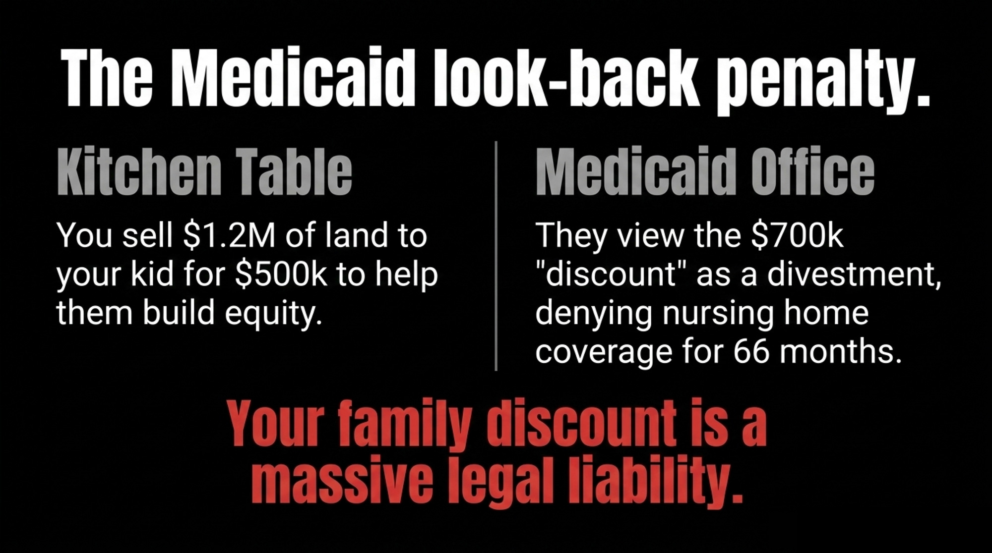 - If any founder in your family is over 65 and you’re planning a deep “family discount” on land or quota, assume Medicaid will count the gap as a divestment if nursing‑home care arrives within five years. Build the transfer outside the 60‑month window or reframe it as a documented sale at fair market value.