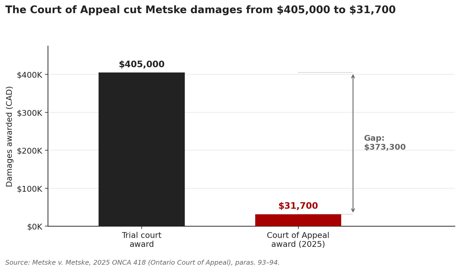 A trial judge valued six years of working the Metske family dairy at $405,000. The Ontario Court of Appeal cut it to $31,700. The $373,300 gap is what a handshake is worth in court.