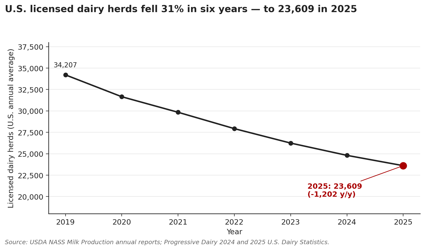The farm count keeps dropping, too. USDA NASS reported 23,609 licensed U.S. dairies on average in 2025 — a loss of 1,202 operations from 2024, a 4.6% national decline in a single year. Pennsylvania alone accounted for 490 of those exits, an 11.7% single‑year hit (Farmshine, February 2026). Milk price and input costs drive plenty of those exits. But ag lawyers and lenders keep flagging a different pattern: estate disputes, probate delays, and succession breakdowns are turning otherwise viable operations into dispersal catalogs.