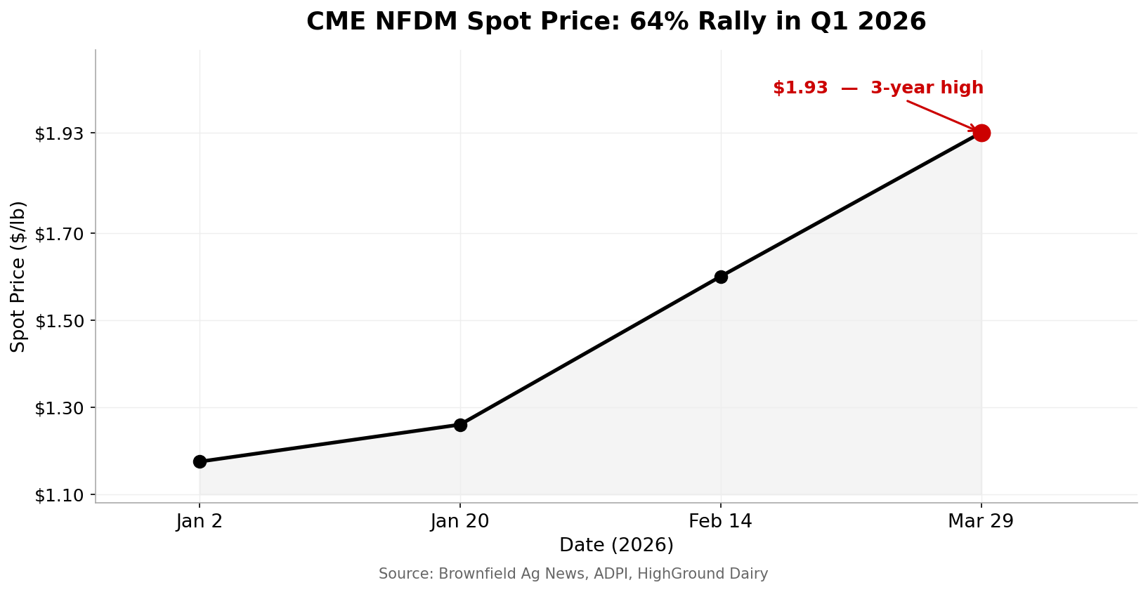 At the first 2026 Global Dairy Trade auction (Event 395), the GDT Price Index jumped 6.3% — snapping a string of declines stretching back to August 2025. A February auction posted another strong gain, driven by whole and skim milk powder. On the Board, CME spot nonfat dry milk opened the year at exactly $1.1750/lb on January 2, according to Brownfield Ag News. By January 20, Federal Order 30 data had it at $1.26/lb. ADPI’s January Dairy Economist Ingredient Outlook confirmed CME NFDM rallied to the mid‑$1.40s by month’s end. By early February, HighGround pegged it at $1.60/lb — a gain of nearly 40% in a matter of weeks. And by March 29, Brownfield had it at $1.93/lb, the highest level since mid‑2022. That kind of move makes you forget what’s sitting on the other side of summer.