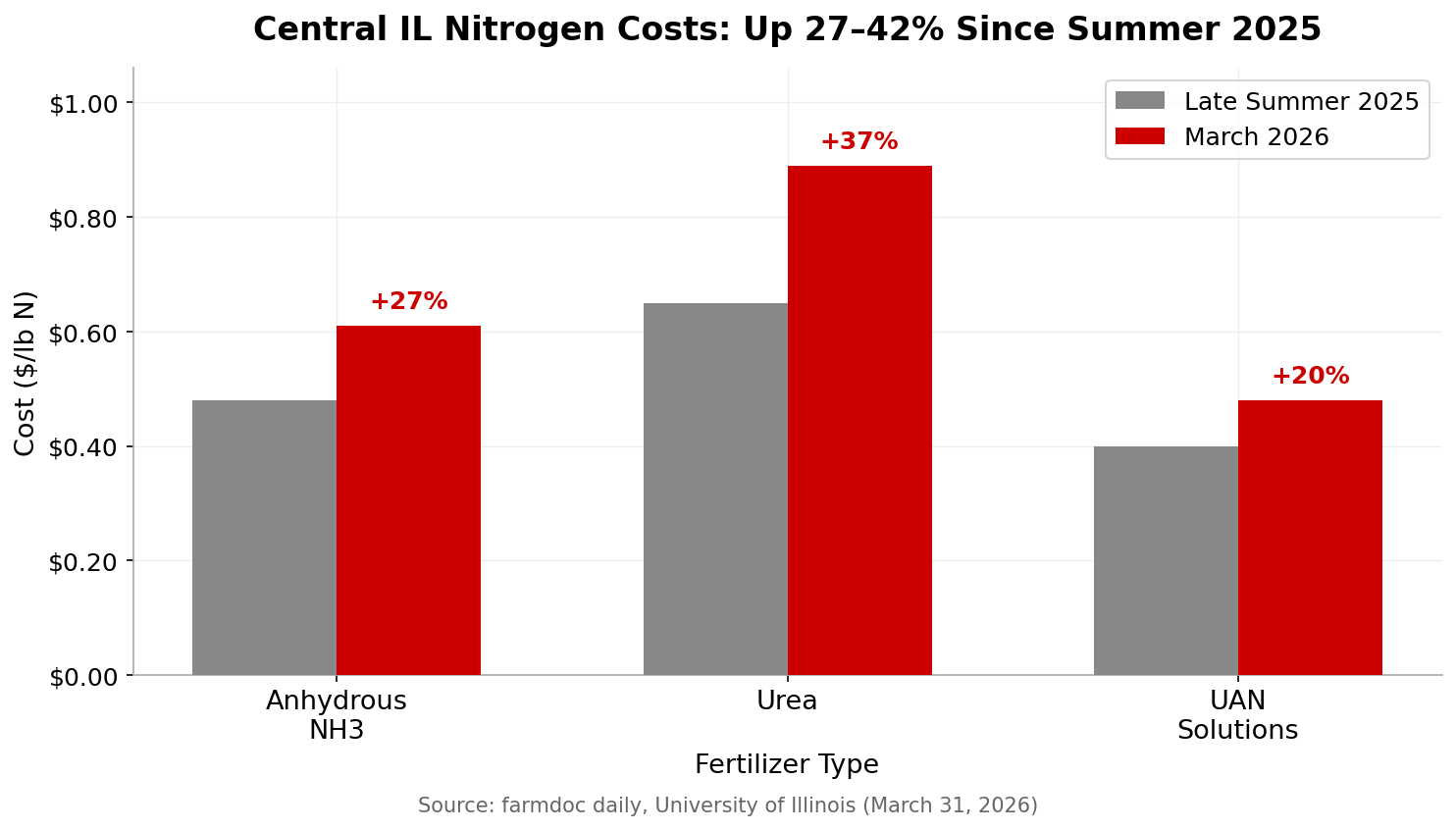 - Anhydrous ammonia: roughly $0.48/lb N in Aug–Sep 2025 → $0.51 in February → $0.61/lb N by March 20, 2026.