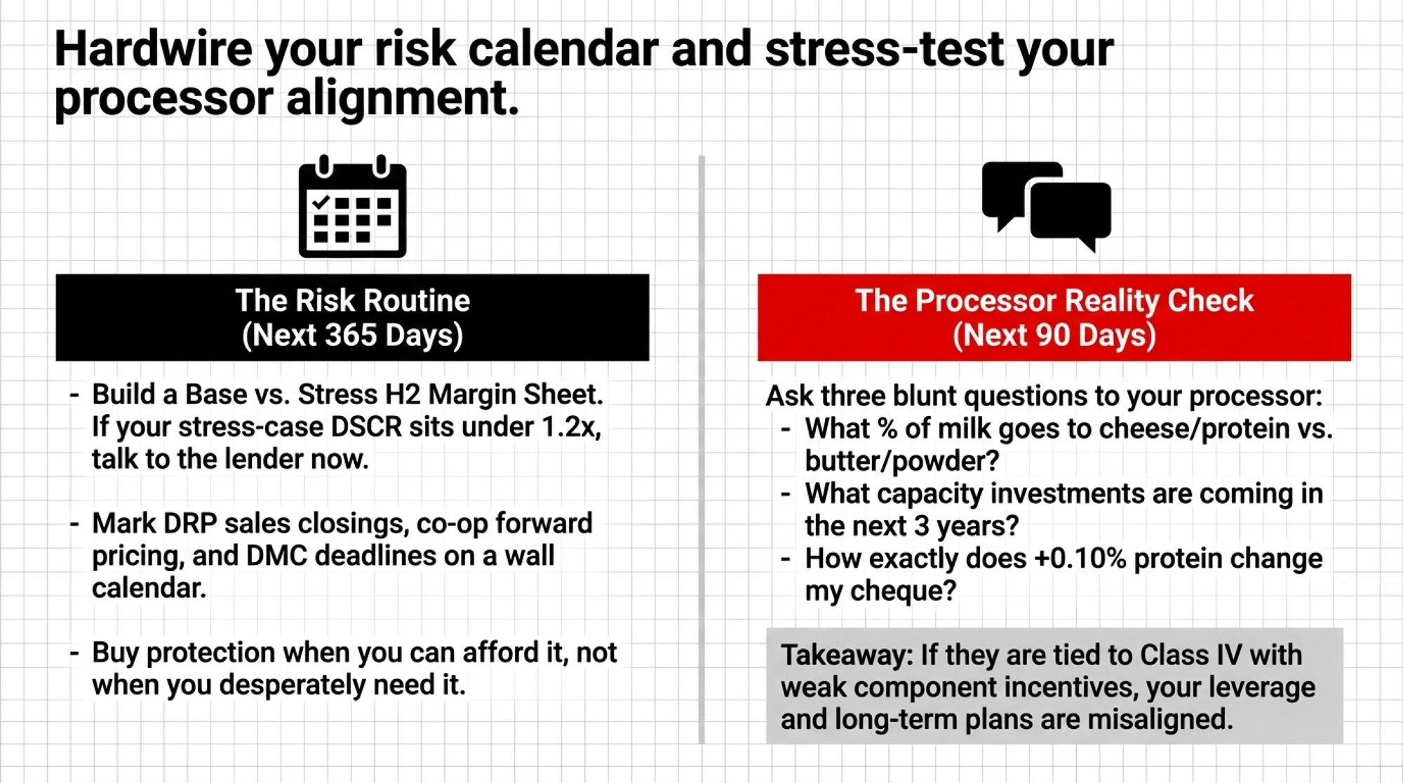 | Ask processor 3 blunt questions (milk end-use) | Next 90 days | Shipping into a plan you don’t understand | 🟠 High |