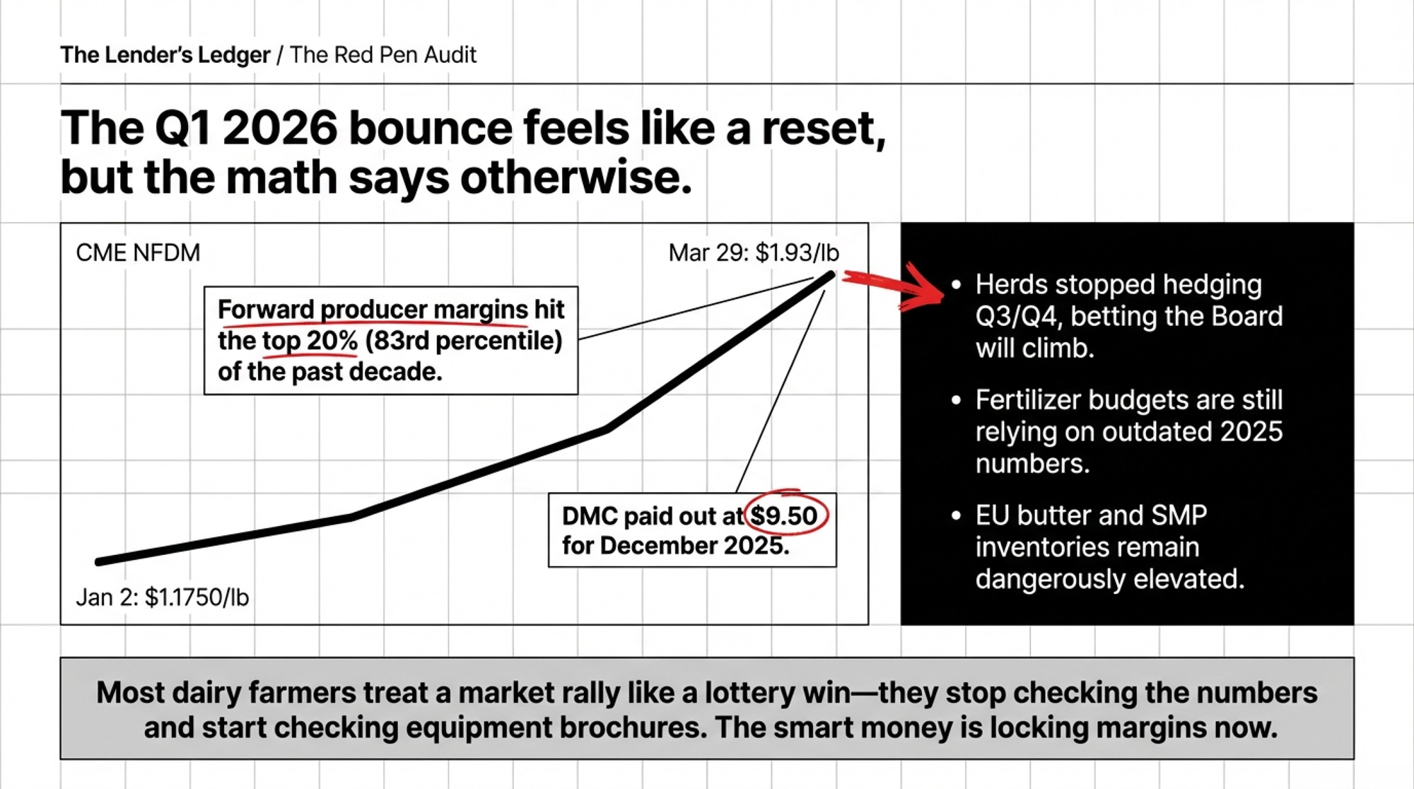 Most dairy farmers treat a market rally like a lottery win — they stop checking the numbers and start checking the equipment brochures. Ken McCarty isn’t most farmers. While the rest of the industry basks in the glow of the Q1 2026 bounce, the smart money is already bracing for the $146,000 trap waiting in the H2 tall grass. If you aren’t mathing your margin right now, your lender is about to do it for you — and you won’t like their answer.