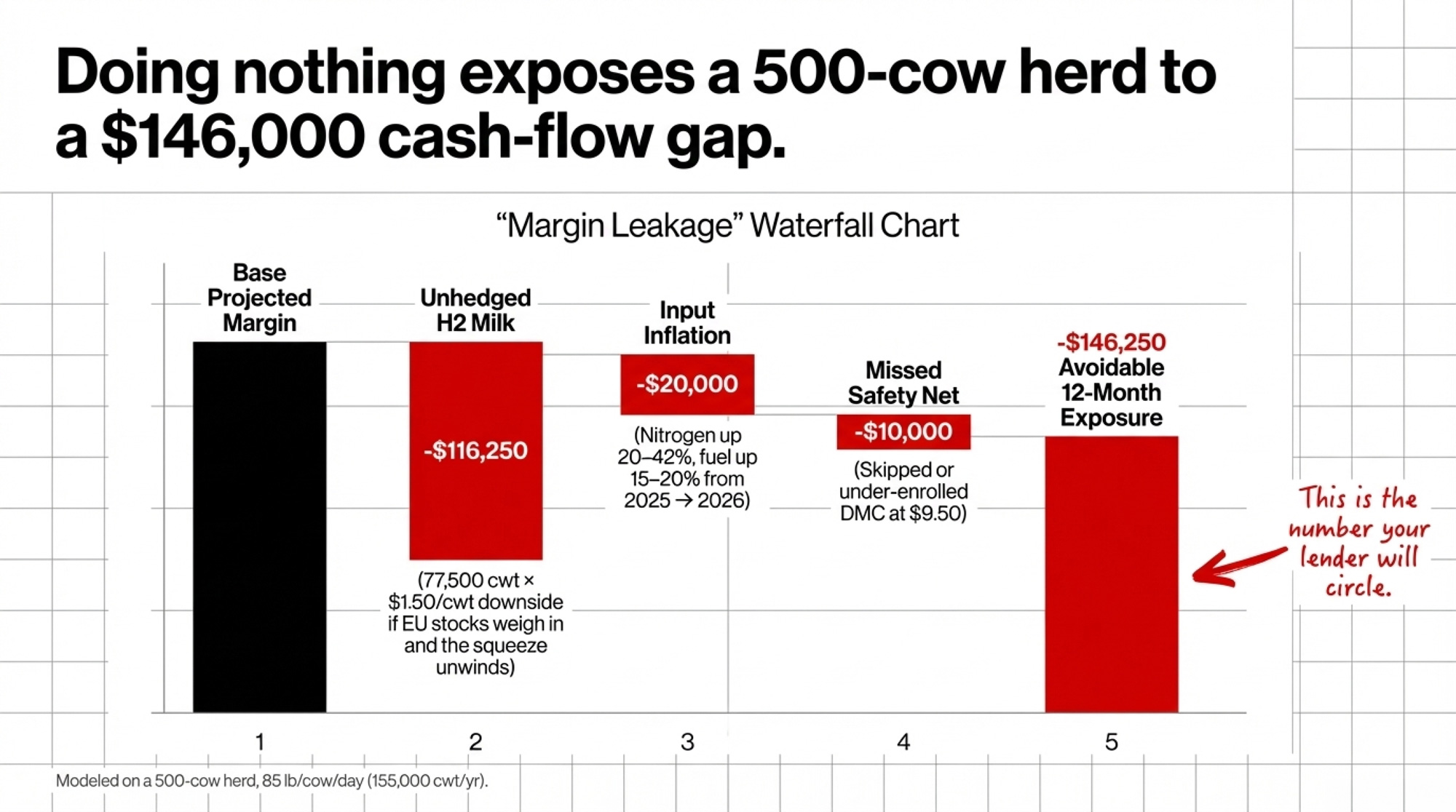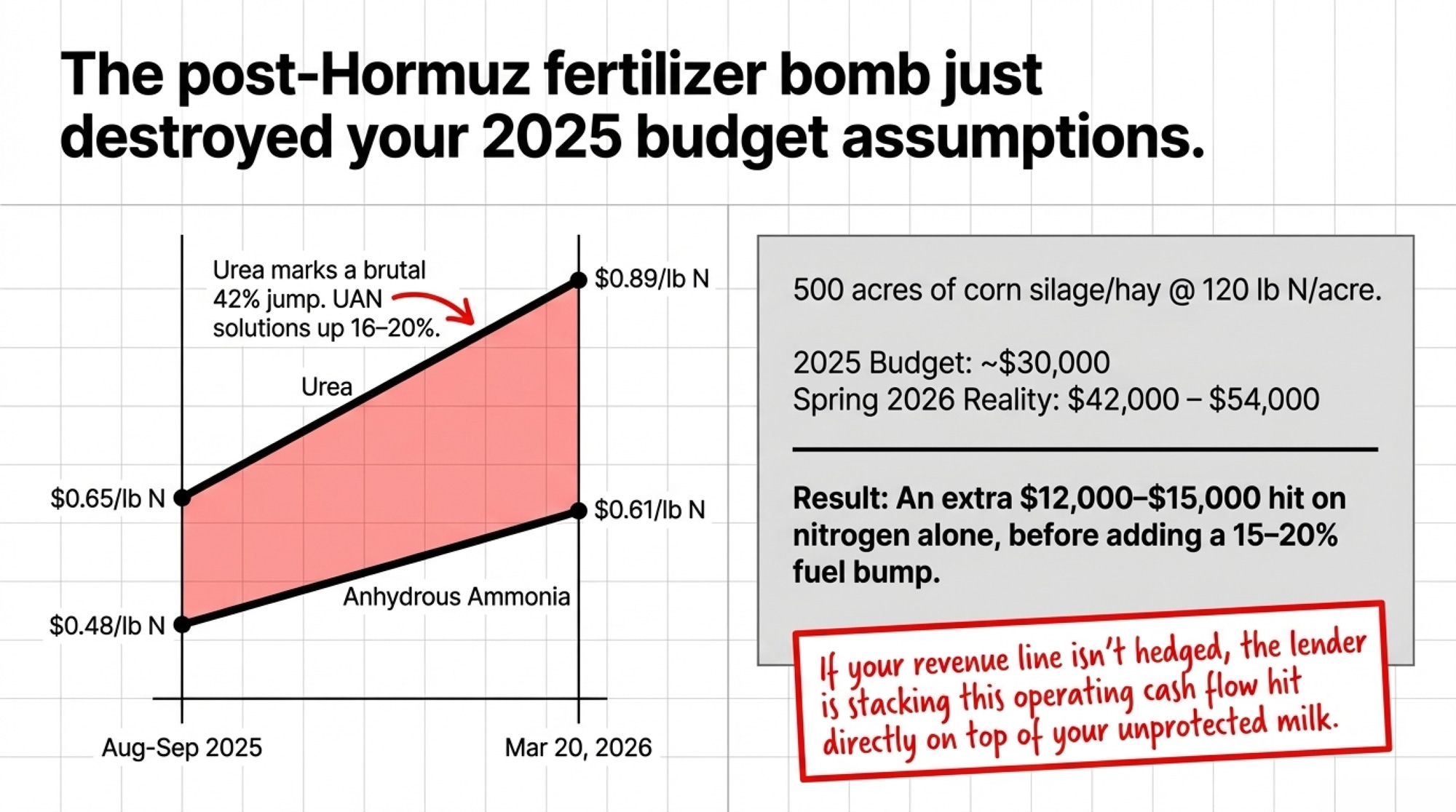 [Lender’s View] Your lender sees that ,000 fertilizer gap as a direct hit to operating cash flow — and if your revenue line isn’t hedged, they’re stacking it on top of the unprotected milk. That’s how a “good year” turns into a covenant conversation.