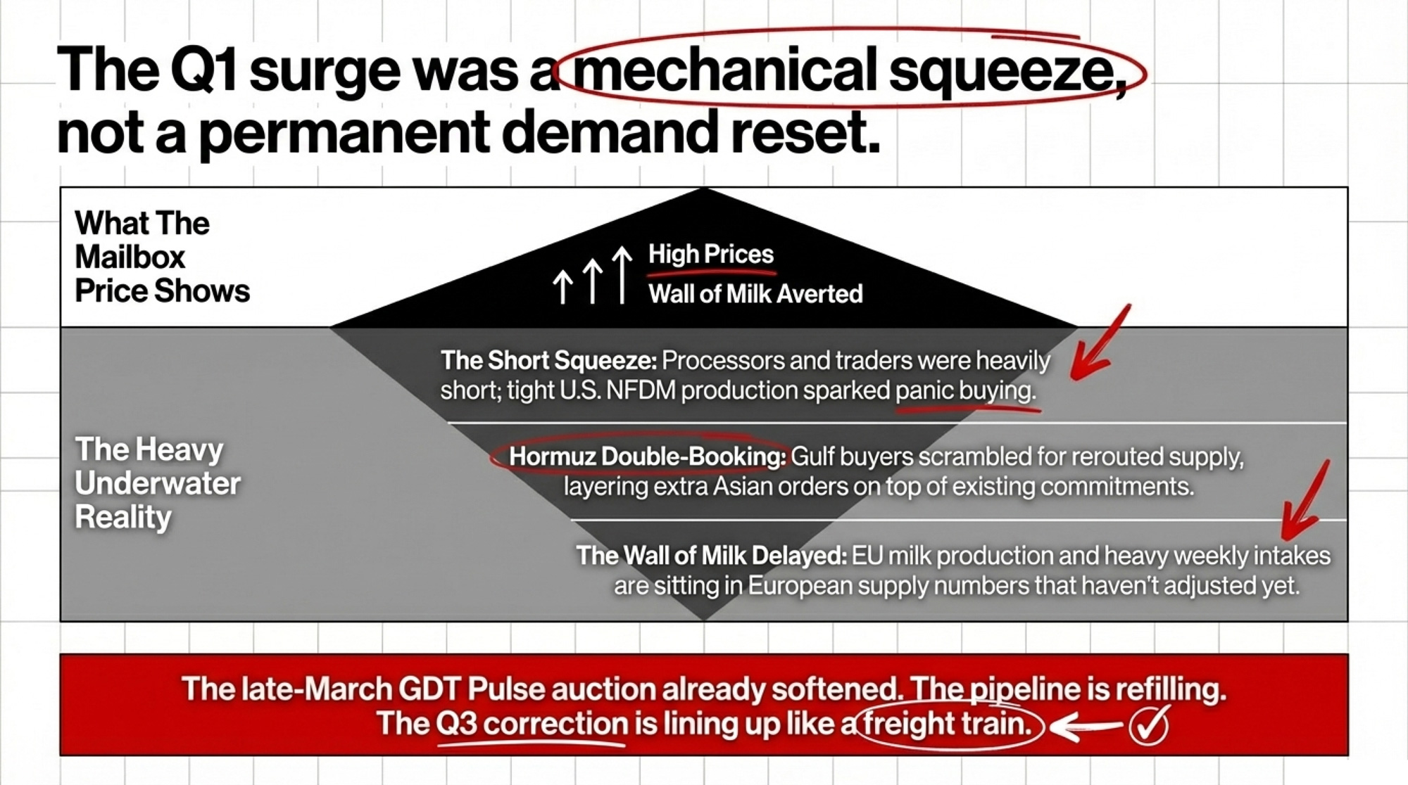 The Q3 correction is lining up like a freight train, and a lot of herds are standing on the tracks with a Q1 smile. The wall of milk didn’t crash into Q1 the way early bears predicted. But it didn’t vanish, either. It’s sitting in European supply numbers that haven’t adjusted yet. If panic buying fades, Gulf shipping normalizes, and EU intake stays firmer than models expect, the mechanical rally that saved your Q1 Mailbox Price sets you up for an H2 where Class III and IV give back part of the gains.