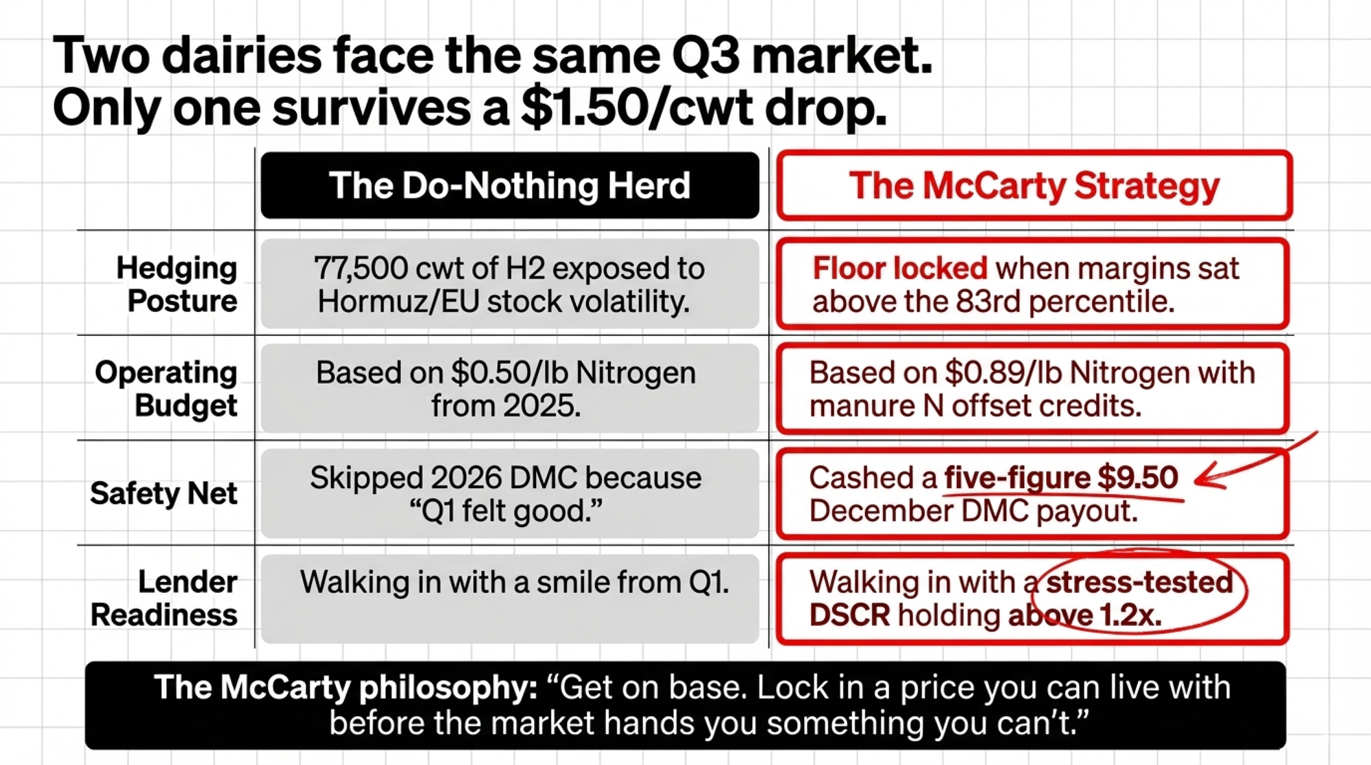One operation walks into their lender meeting with DRP confirmations, and a fertilizer pre‑buy that proves H2 floor revenue covers term debt even in a stress case. Another walks in with a smile from Q1, a budget using last year’s N prices, and 77,500 cwt of H2 production exposed to whatever EU butter stocks and Hormuz do next.