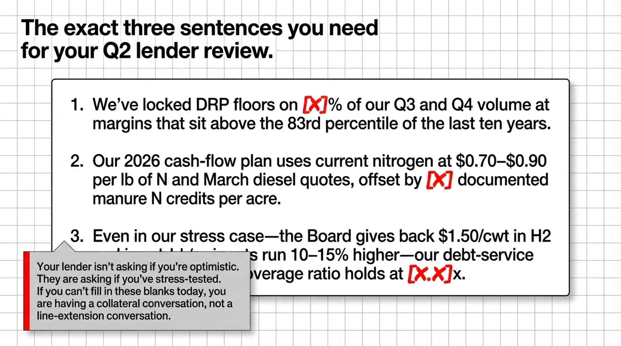 - If your stress‑case H2 DSCR comes in under ~1.2x, your lender sees you as tight. Walk in with proof you’ve acted — DRP floors, updated budgets, manure credits — not just a good attitude.