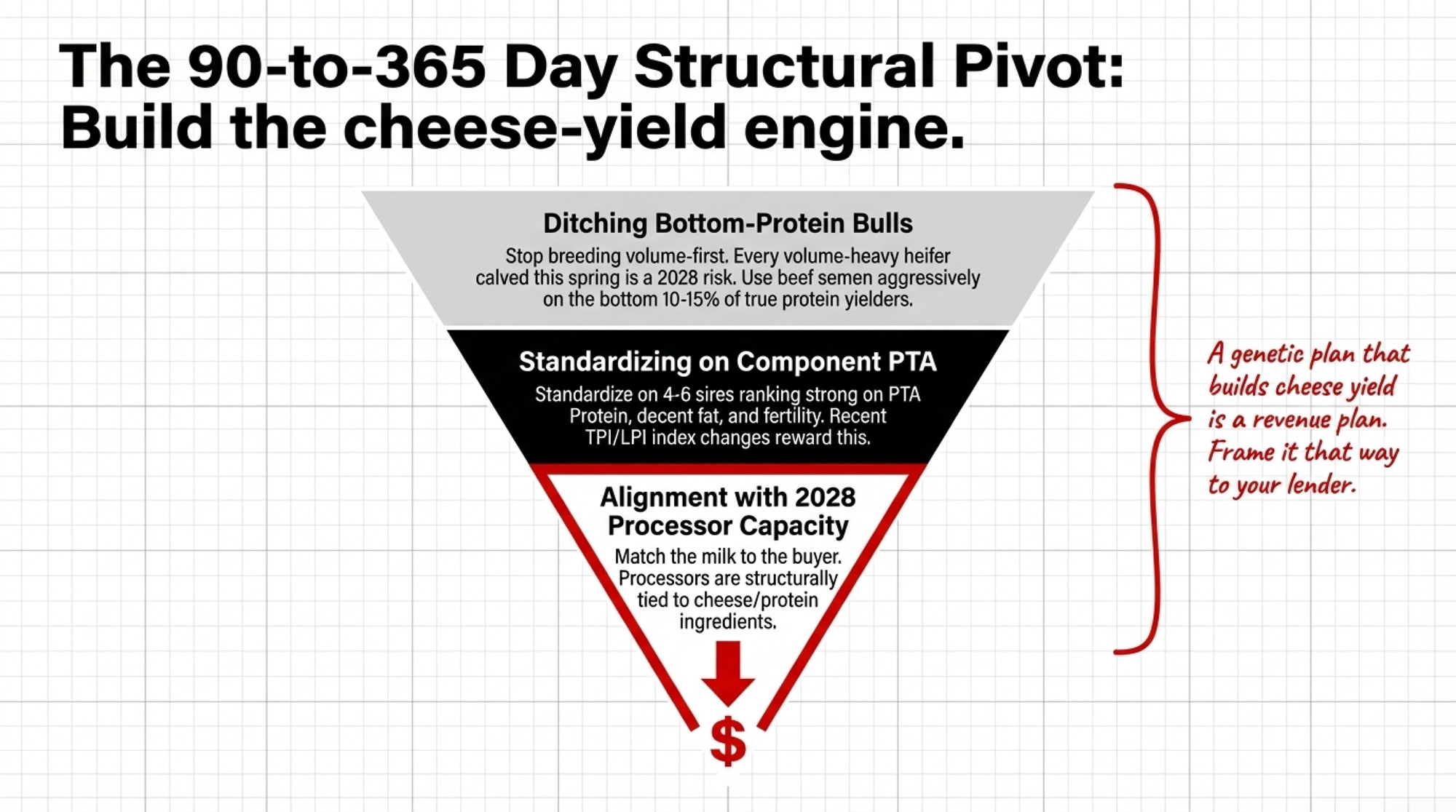 6. Build the cheese‑yield engine — starting with your sire stack. If your herd isn’t building the cheese‑yield engine of 2028, you’re breeding further out of line with a market that’s paying for protein and cheese yield, not liters. Every volume‑only heifer you calve this spring pushes you in the wrong direction in a Q3 2026 market that rewards components. Drop the bottom protein bulls. Standardize on 4–6 sires that rank strong on PTA Protein, decent fat, and good fertility. Recent TPI and Canadian LPI index changes increased the protein’s weight because processors and pricing structures are doing the same.