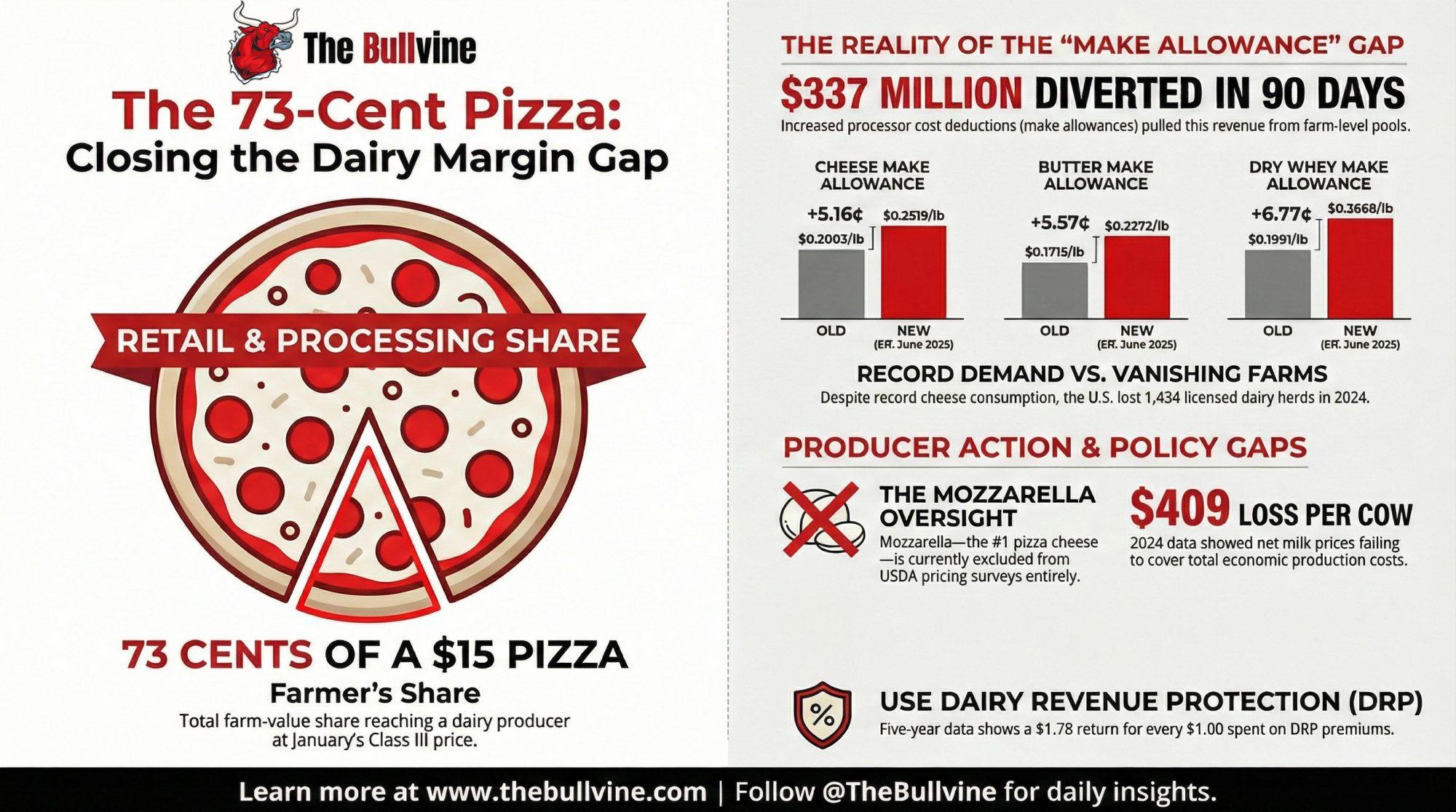 EXECUTIVE SUMMARY: Americans are tearing into an estimated 29 million pounds of cheese today — six times normal daily volume — and the dairy farmer’s cut of a $15 Super Bowl pizza is 73 cents at January’s Class III price of $14.59/cwt. USDA’s June 2025 make allowance increases widened that gap, diverting an additional 85–93 cents per hundredweight from producer pools to processors and pulling $337 million from farm-level revenue in the first 90 days alone, per the American Farm Bureau Federation’s analysis. The demand story is real; the margin story isn’t. Illinois FBFM data shows dairy operations lost $409 per cow in 2024 on a total economic cost basis — even with per capita cheese consumption hovering near all-time highs. Wisconsin producer Mike Yager calculated the make allowance hit on his 275-cow Mineral Point operation at roughly $55,868 per year in value that now stays with the processor, and says no new premiums have materialized to offset it. If your cash costs are above $17.50/cwt and your order’s blend is anywhere near Class III, your working capital is eroding monthly — and tonight’s pizza binge won’t change that. The lever that matters now: ensuring USDA’s mandatory biennial processor cost surveys — authorized under the One Big Beautiful Bill Act signed July 4, 2025 — launch on a concrete timeline and include mozzarella, the dominant Super Bowl cheese, which is currently excluded entirely from USDA pricing surveys.”