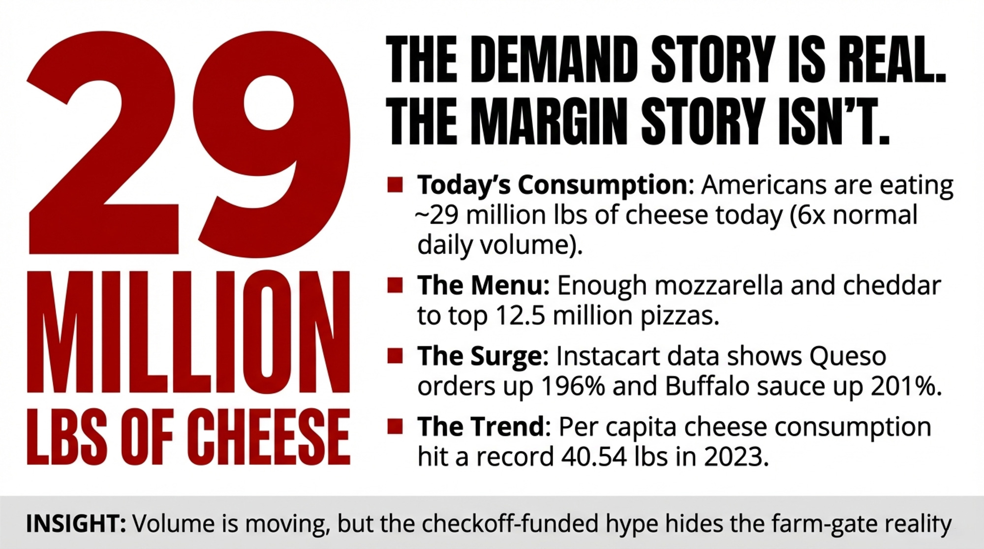 - 29 million pounds of cheese was priced into processor contracts weeks ago. Game-day demand doesn’t create spot-market pressure that flows back to your bulk tank. The consumption is real; the price signal to producers is at best muted.
