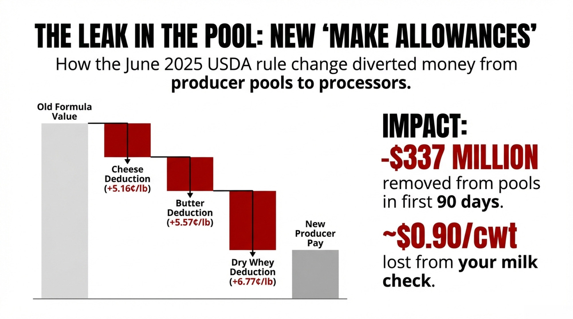 The American Farm Bureau Federation’s Danny Munch calculated the early damage: class price reductions ranging from 85 to 93 cents per hundredweight, pulling roughly $337 million out of combined producer pool values in just the first 90 days (AFBF Market Intel, September 21, 2025). As Munch told RFD-TV: “Dairy farmers were most concerned about the impact of increased make allowances because they reduce the price farmers receive, and were based on incomplete data during the hearing process”.