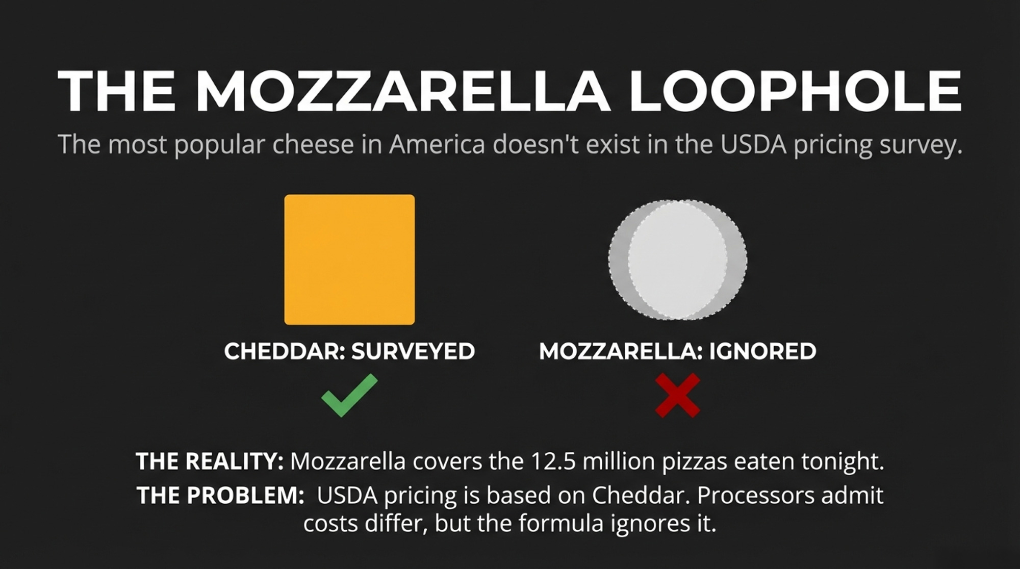 - Mozzarella — tonight’s dominant cheese — isn’t even in the USDA pricing survey. The make allowance was set on cheddar data. Until the survey includes the cheeses that actually drive demand, the formula will keep underpricing your contribution to the products consumers want most.