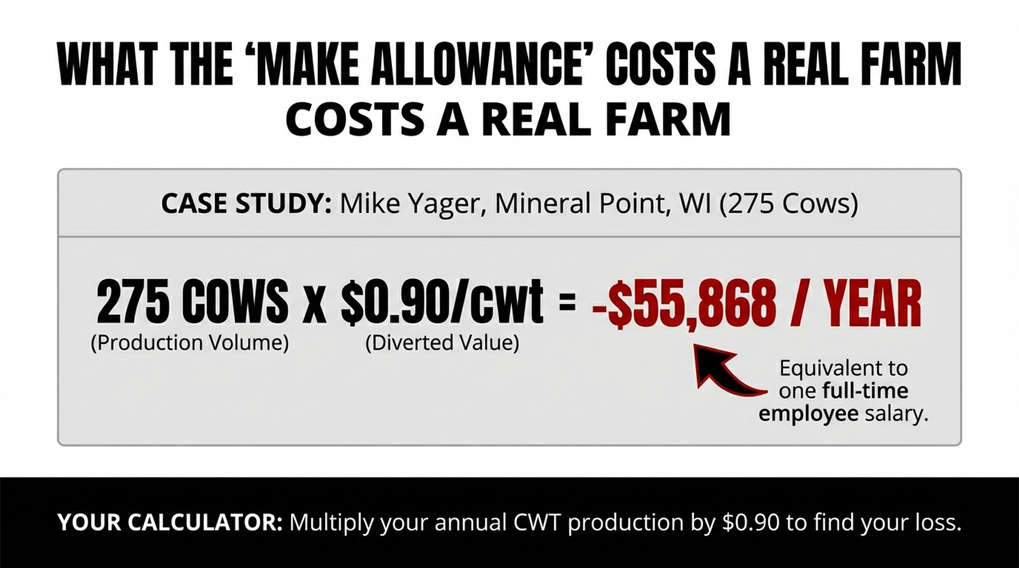 Mike Yager milks 275 Holsteins and grows feed crops near Mineral Point, Wisconsin — squarely in Federal Order 30, the Upper Midwest. When the make allowance increases hit last June, he did his own calculation: that additional 90 cents per hundredweight amounts to roughly $55,868 per year for an average-sized Wisconsin dairy in value that now stays with the processor instead of reaching the bulk tank. To estimate your own hit: multiply your total hundredweight shipped per year by $0.90. A 500-cow herd shipping around 110,000 cwt annually loses roughly $99,000 in pool value.