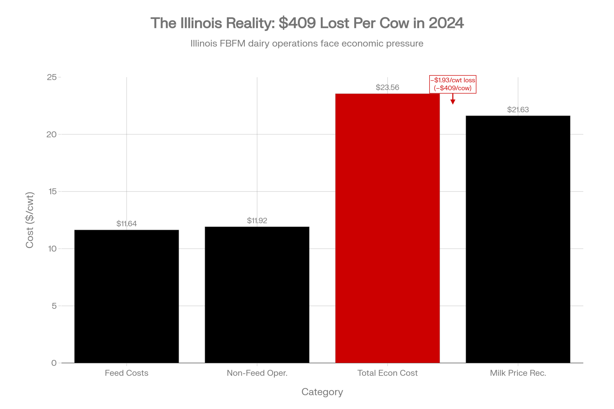 Illinois Farm Business Farm Management data tells the broader story. The 2024 numbers showed an average net milk price of $21.63 per hundredweight against total economic costs of $23.56 — a loss of $1.93/cwt, or negative $409 per cow for the year. Feed costs averaged $11.64/cwt, and nonfeed costs hit a record $11.92/cwt. SDA ERS’s January 2026 Livestock, Dairy, and Poultry Outlook forecasts the 2026 all-milk price at $18.25 per hundredweight, down from $21.15 in 2025 — a decline of nearly $3.00/cwt, or roughly 14% . That’s a wider drop than feed cost savings can absorb.” This is the single most important factual correction in this draft.