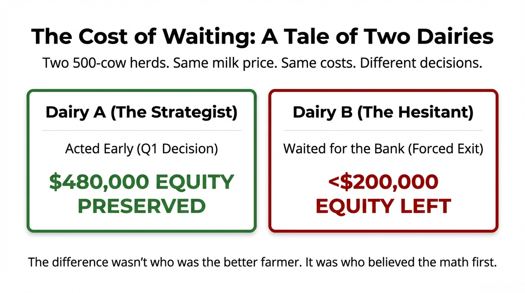 The family down the road, milking a similar herd, waited. By the time their lender initiated the conversation, the number was under $200,000.