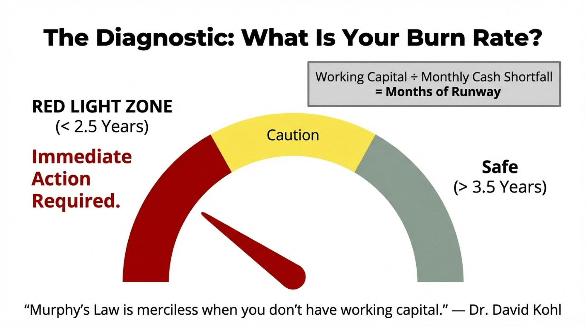 | This Week | Calculate burn rate: Working capital ÷ monthly shortfall | Kohl says minimum 3.5 years; below 2.5 years = red-light zone | Know exact months of runway |