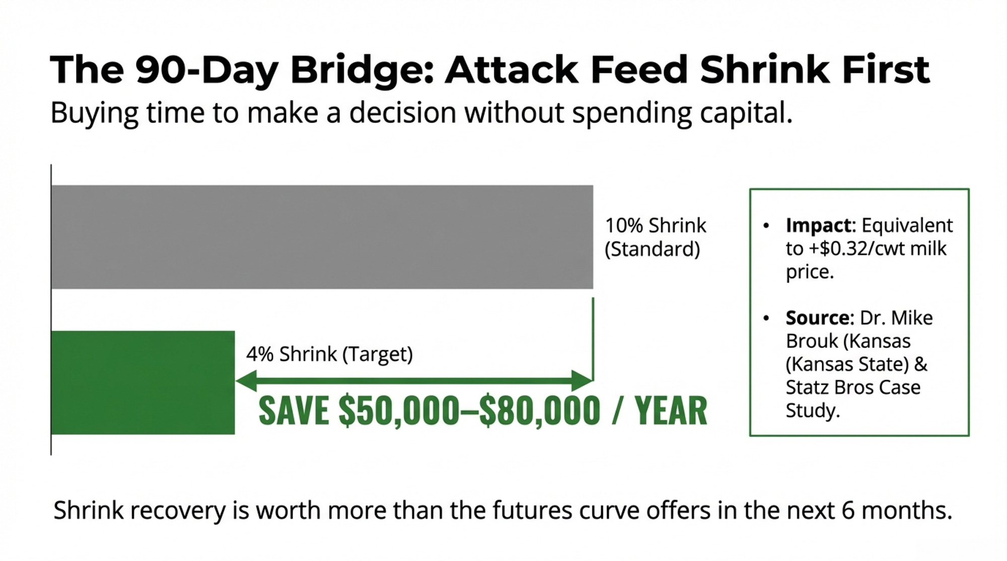 - Feed shrink is your 90-day bridge — not your solution. Kansas State puts recoverable savings at $50,000+ for a 500-cow herd. The Statz Brothers captured over $500,000 annually on 4,400 cows. That buys runway. Use it to fund a path choice, not to delay one.